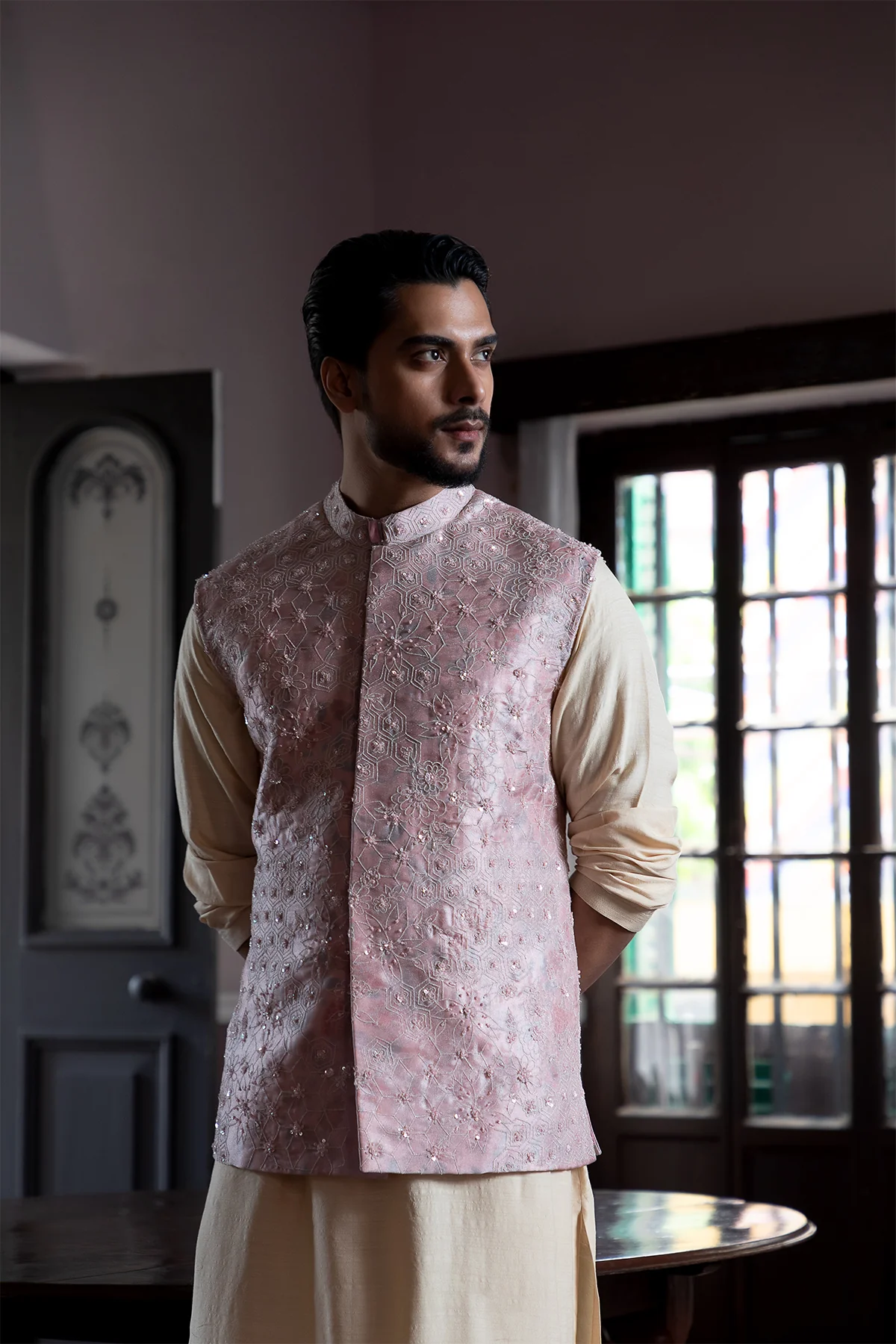 This statement piece blends traditional silhouettes with unexpected fabrics. The outer layer features a captivating interplay of textures: organza's weightless drape adds a touch of breezy elegance, while mudal satin's smooth luster creates a sophisticated base. Look closer, and you'll discover a hidden layer of breathable mul cotton for everyday comfort, ensuring you stay cool during any occasion. Hints of munga georgette's unique texture peek through, adding a touch of modern flair and a subtle sheen. This versatile jacket is perfect for the discerning the man who appreciates both tradition and a touch of unconventional style.