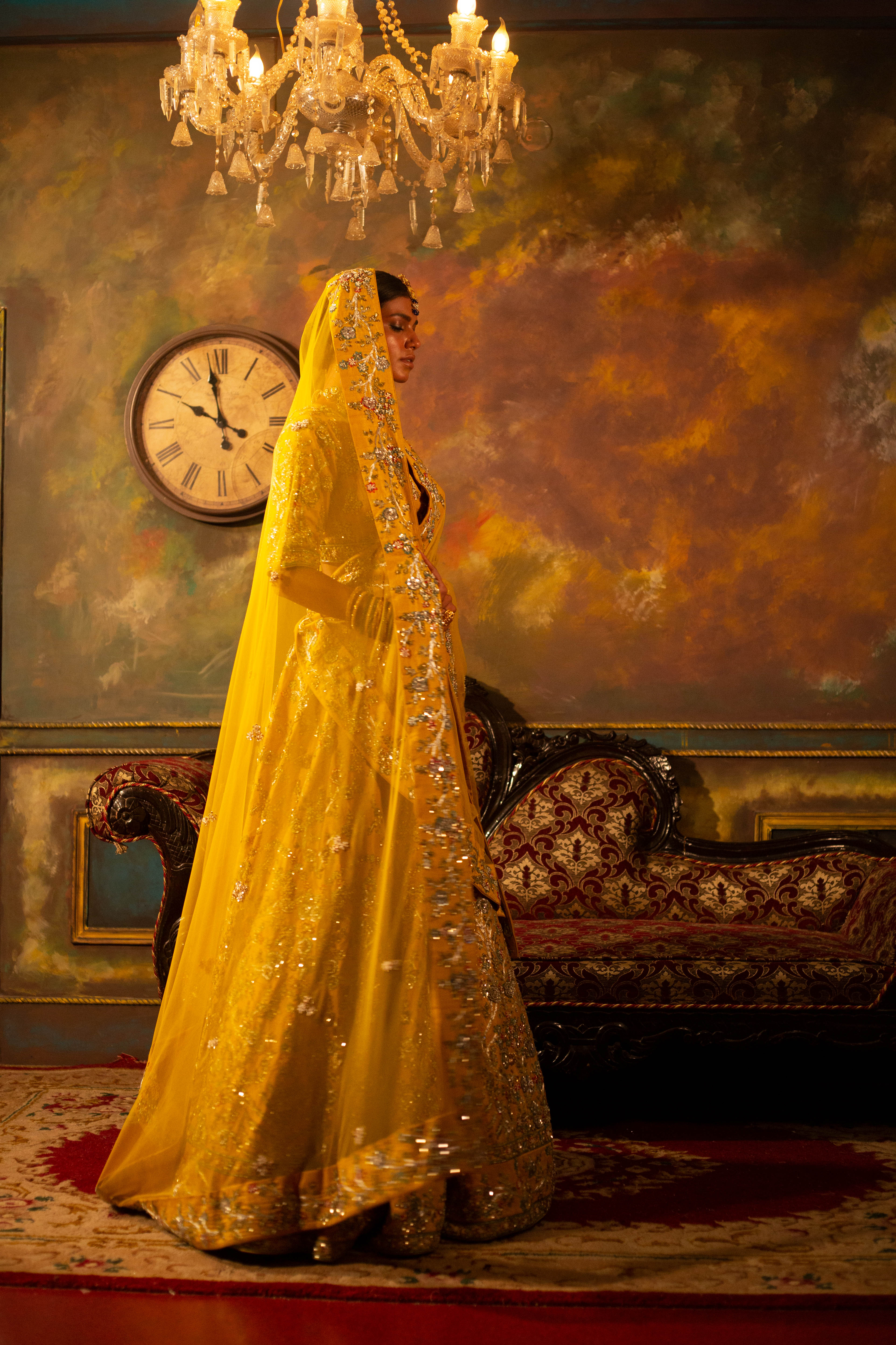 Embark on a journey of luminous allure with the Golden Eclat Lehenga, a harmonious blend of raw silk, satin, cambric, and net fabrics in a resplendent yellow hue. The ensemble captures the essence of timeless elegance, ensuring you radiate regal allure at every celebration. With a thoughtful fusion of textures and the radiant color palette, this masterpiece becomes a canvas of opulence and sophistication, making your special moments truly golden.