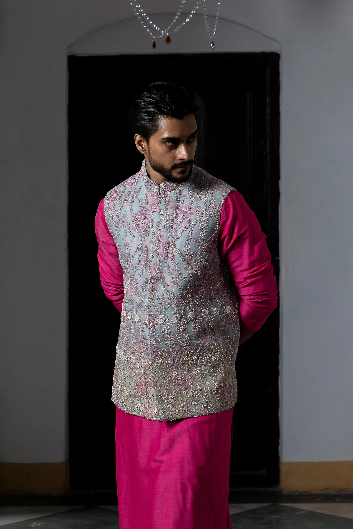 This versatile jacket transcends the boundaries of typical menswear fabrics. Organza's weightless drape adds a touch of unexpected elegance, while mudal satin's smooth luster elevates your look for a touch of sophisticated luxury. For everyday comfort, a hidden layer of breathable mul cotton ensures you stay cool, while a touch of munga georgette's unique texture with a subtle sheen peeks through, adding a hint of modern flair. This innovative jacket is a testament to the art of pushing boundaries in fashion.