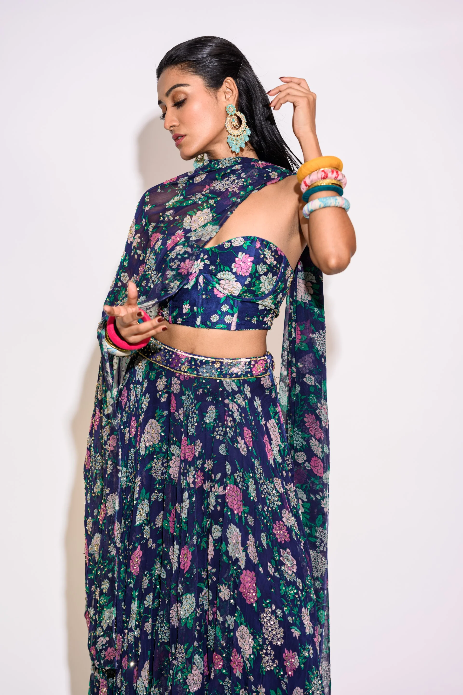 A floral printed lehenga in chiffon fabric that is accentuated with intricate embroidery work at the waistline. It is offset with a matching strapless corset blouse. A dupatta in the same print and color completes the look. This combination of clothing creates a stunning, elegant look that is both traditional and timeless.