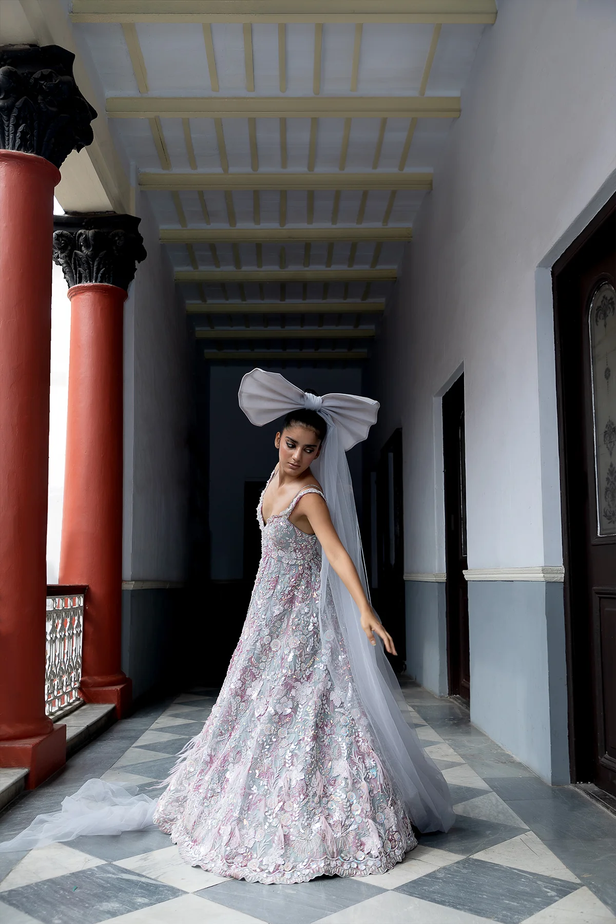 This ethereal gown in a mesmerizing blue lavender is a masterpiece. Hand-embroidered artwork, a personal symbol brought to life with rich thread, adorns the organza. Delicate feathers, a whisper against the bold embroidery, add a touch of whimsy. The sheer fabric dances with light, and the unique lavender hue captivates. This is more than a dress, it's an experience waiting to be worn.