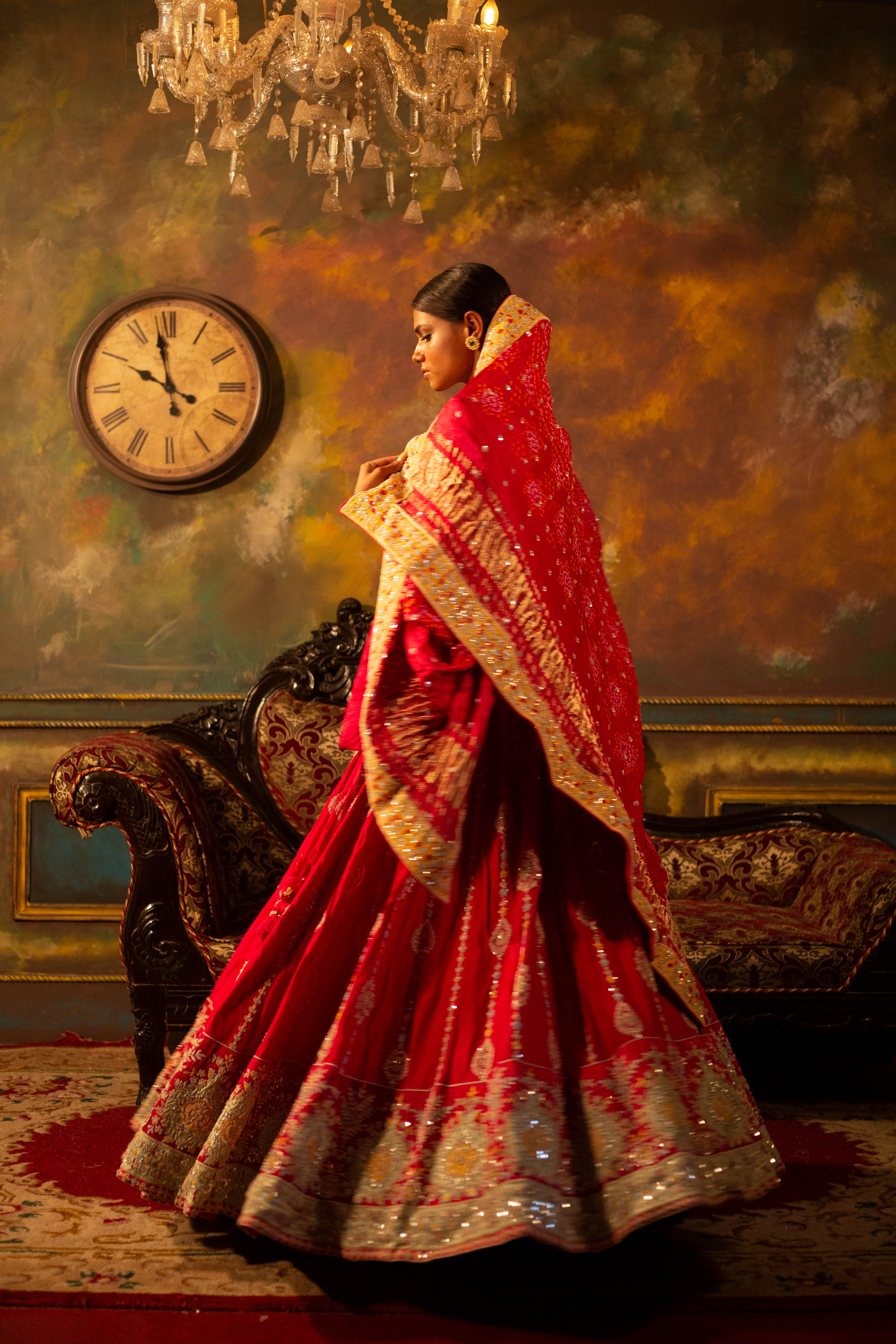 Dulge in opulence with our Cerulean Blush Regalia Lehenga, meticulously crafted from the finest georgette, tussar silk, satin, cambric, and adorned with exquisite Bandhej. The rich and regal dark pink hue elevates this ensemble to a symphony of sophistication. Every thread tells a tale of artistry, creating a masterpiece that transcends the ordinary, ensuring you radiate timeless elegance on your special day.