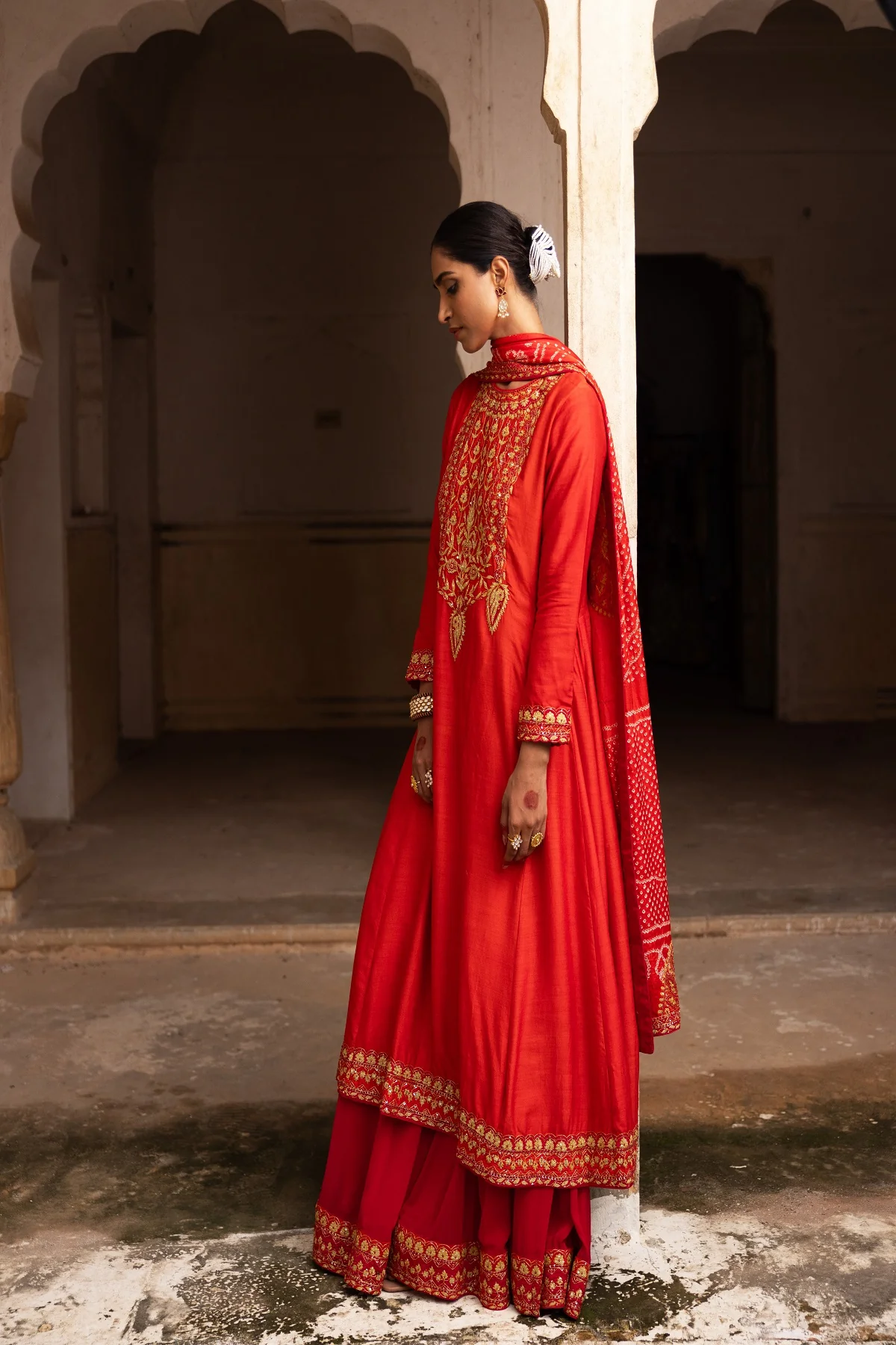 Our Luxe Legacy sharara set, made from pure mul georgette, flows elegantly, giving you a graceful look. This outfit is complemented by a vibrant Bandhej dupatta that adds a burst of color, making it a perfect match for any occasion.