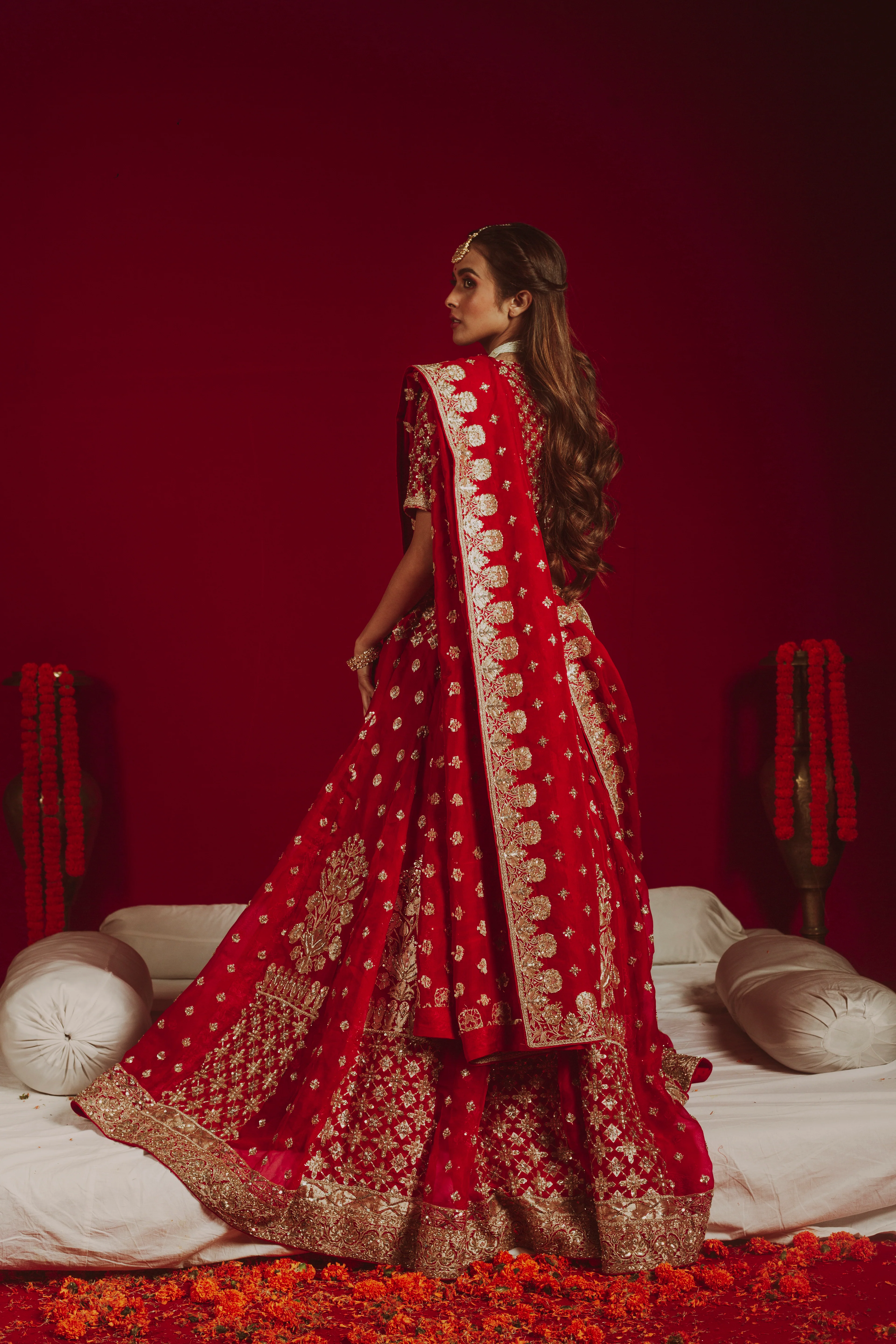 Indulge in opulent beauty with a lehenga crafted from cotton, organza, Banarasi, georgette, and satin fabrics in a striking red hue. The harmonious blend of textures creates a melody of elegance, where each fabric resonates with its unique charm. This ensemble is a celebration of luxurious sophistication, ensuring you captivate the senses with every move in the resplendent richness of red.