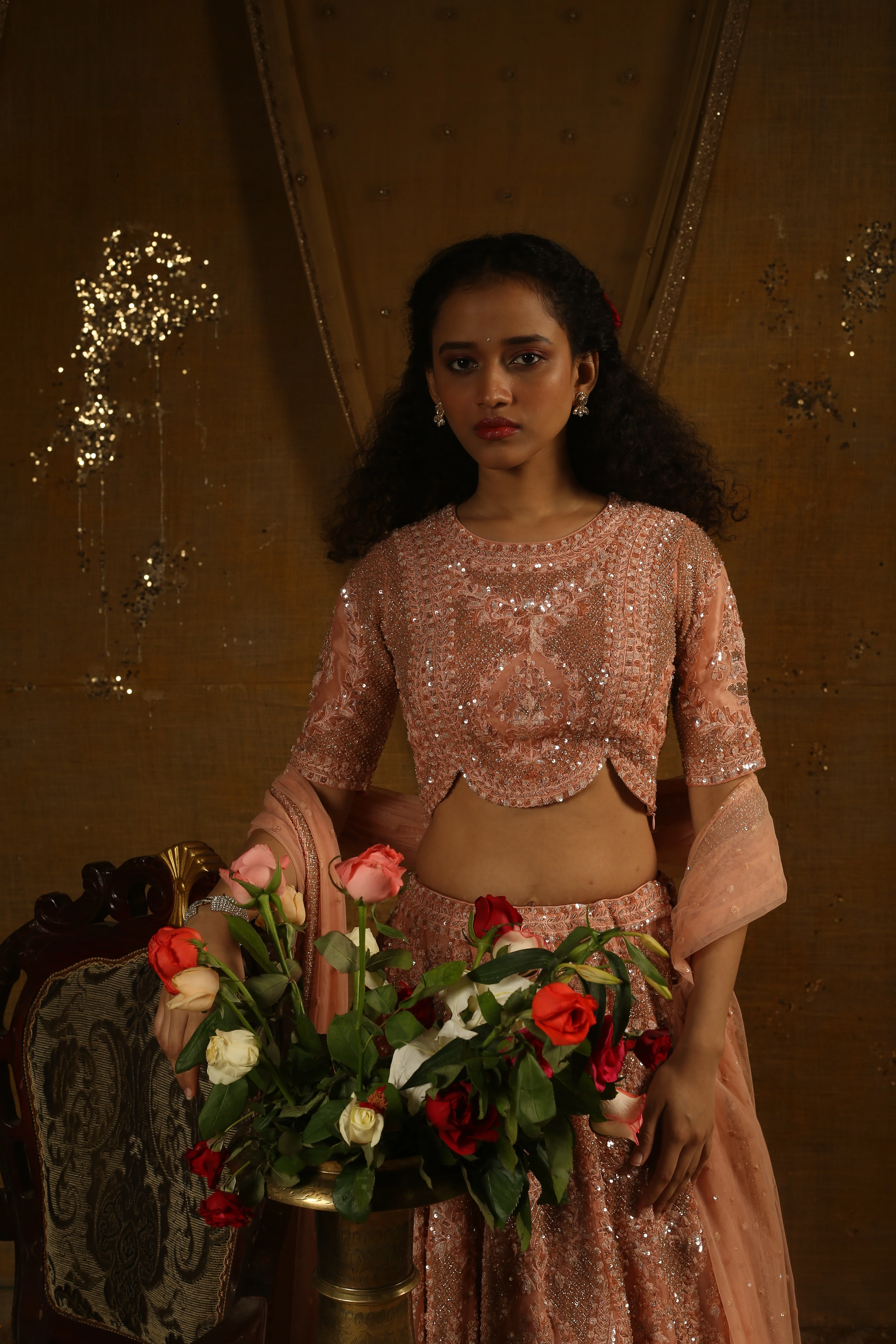 Revel in sophistication with our organza and net lehenga, a symphony of opulence and sheer elegance. The luxurious organza fabric meets the delicate nature of net, creating a harmonious ensemble that embodies timeless beauty. Immerse yourself in the ethereal allure of this exquisite piece, where every step is adorned with grace and charm.