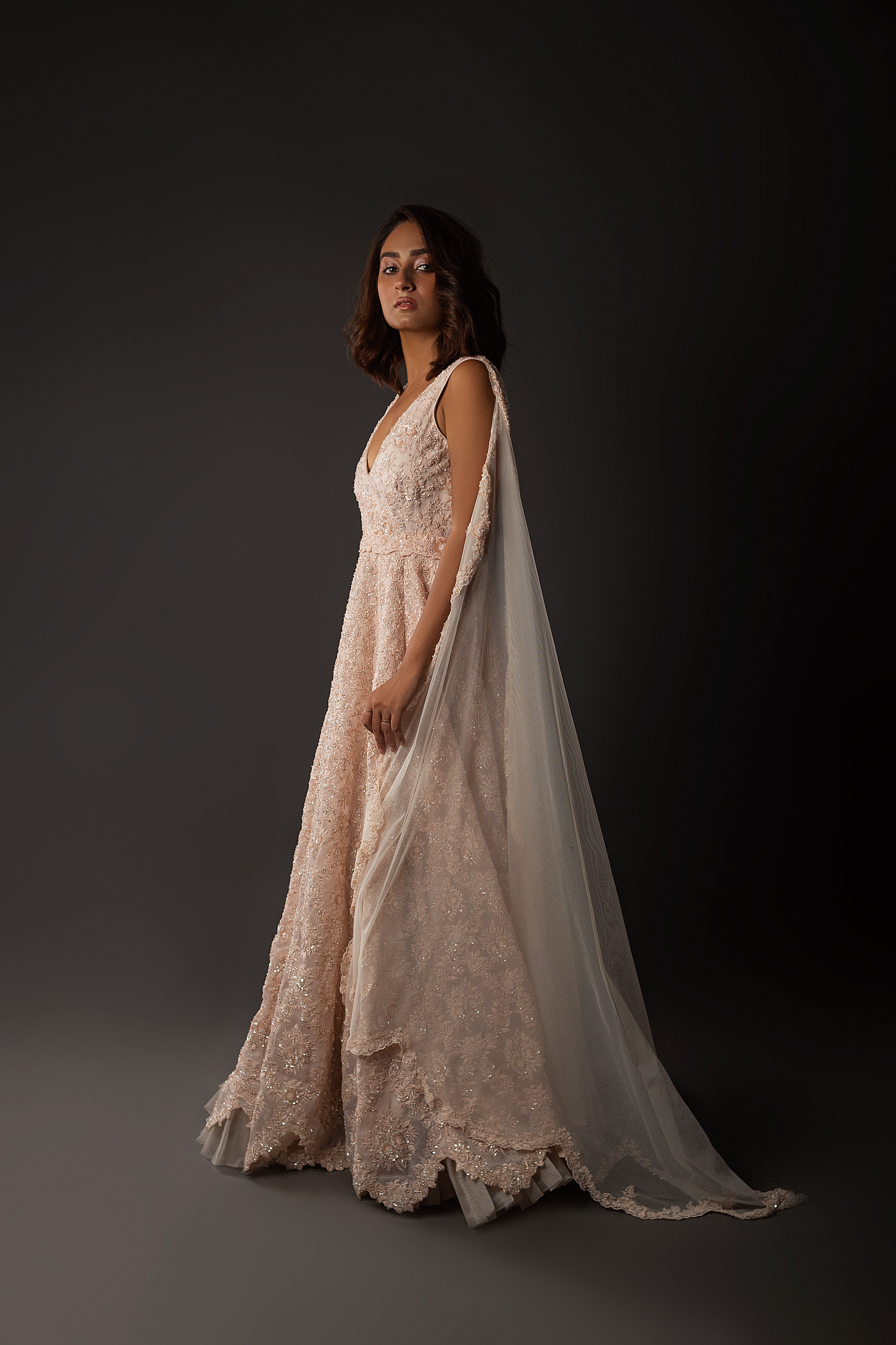 Bask in the allure of our Light Peach Organza Lehenga adorned with intricate appliqué work. This ethereal ensemble whispers sophistication, marrying delicate hues with detailed craftsmanship. Embrace grace and charm as you step into a world of timeless elegance, perfect for those radiant occasions that deserve a touch of refined beauty.