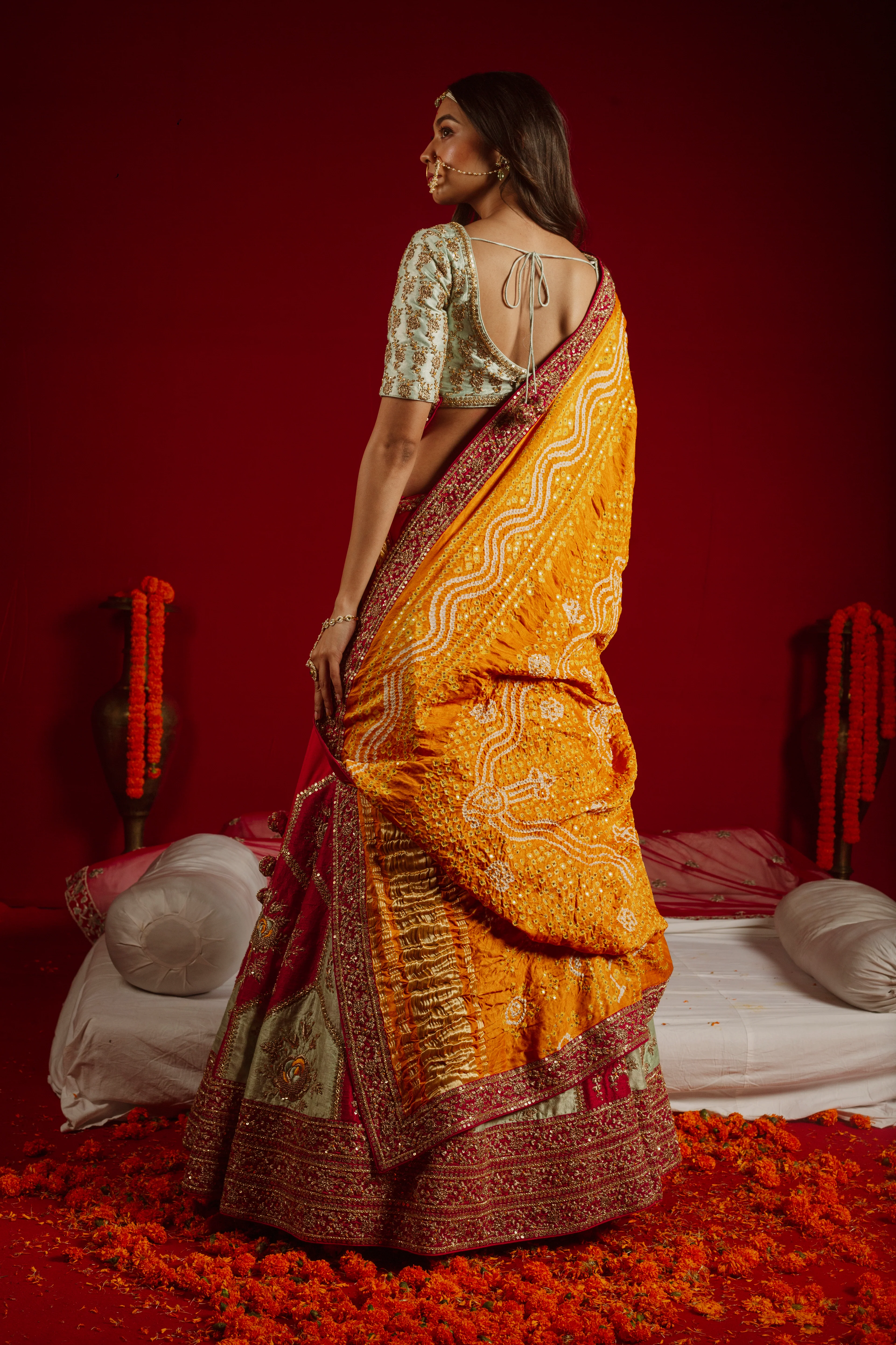 Immerse yourself in the vibrant allure of our Fiesta Bandhej Radiance Lehenga, a medley of bandhej, dupion, satin, cambric, and tussar georgette fabrics in a stunning blend of red and multi-color. The rich combination of textures and hues creates a lively celebration of traditional elegance. This ensemble is a testament to the artistry of craftsmanship, ensuring you stand out with radiant splendor at every moment of your joyous occasion.
