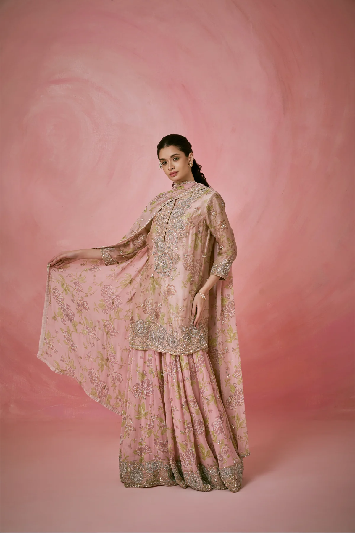The matching organza dupatta adds a dreamy layer, perfect for draping over your shoulders or wearing loosely. Ideal for weddings, festivals, or special celebrations, the Floral Grace sharara set is all about joy and style. Let your beauty shine as you bloom in this enchanting ensemble!