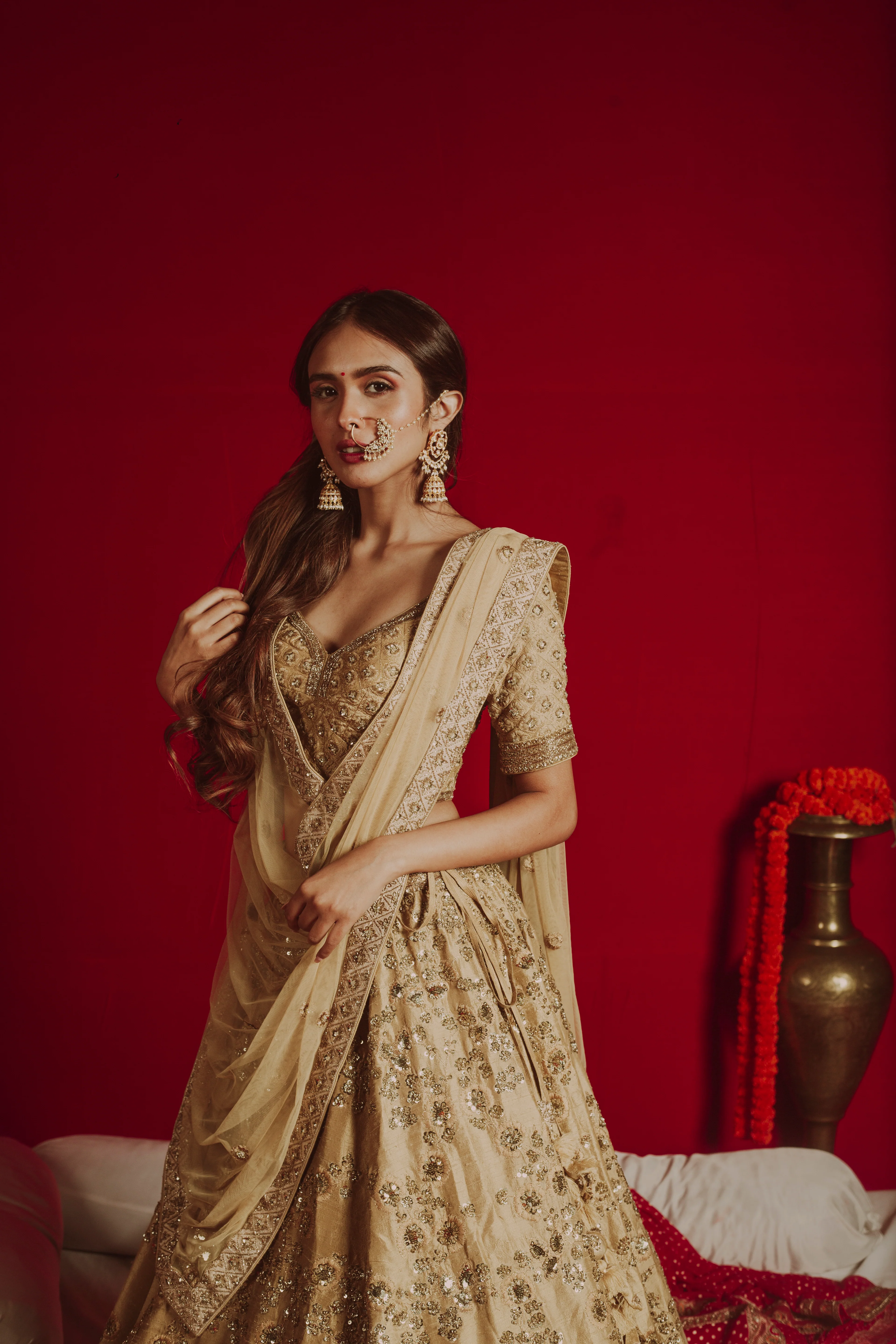 Step into a world of luminous elegance with our lehenga, a harmonious composition of net, dupion, satin, and cambric fabrics in a resplendent golden hue. The intricate combination of textures weaves a symphony of elegance, ensuring you shine with a golden glow on your special day, leaving a trail of radiant memories in every step.