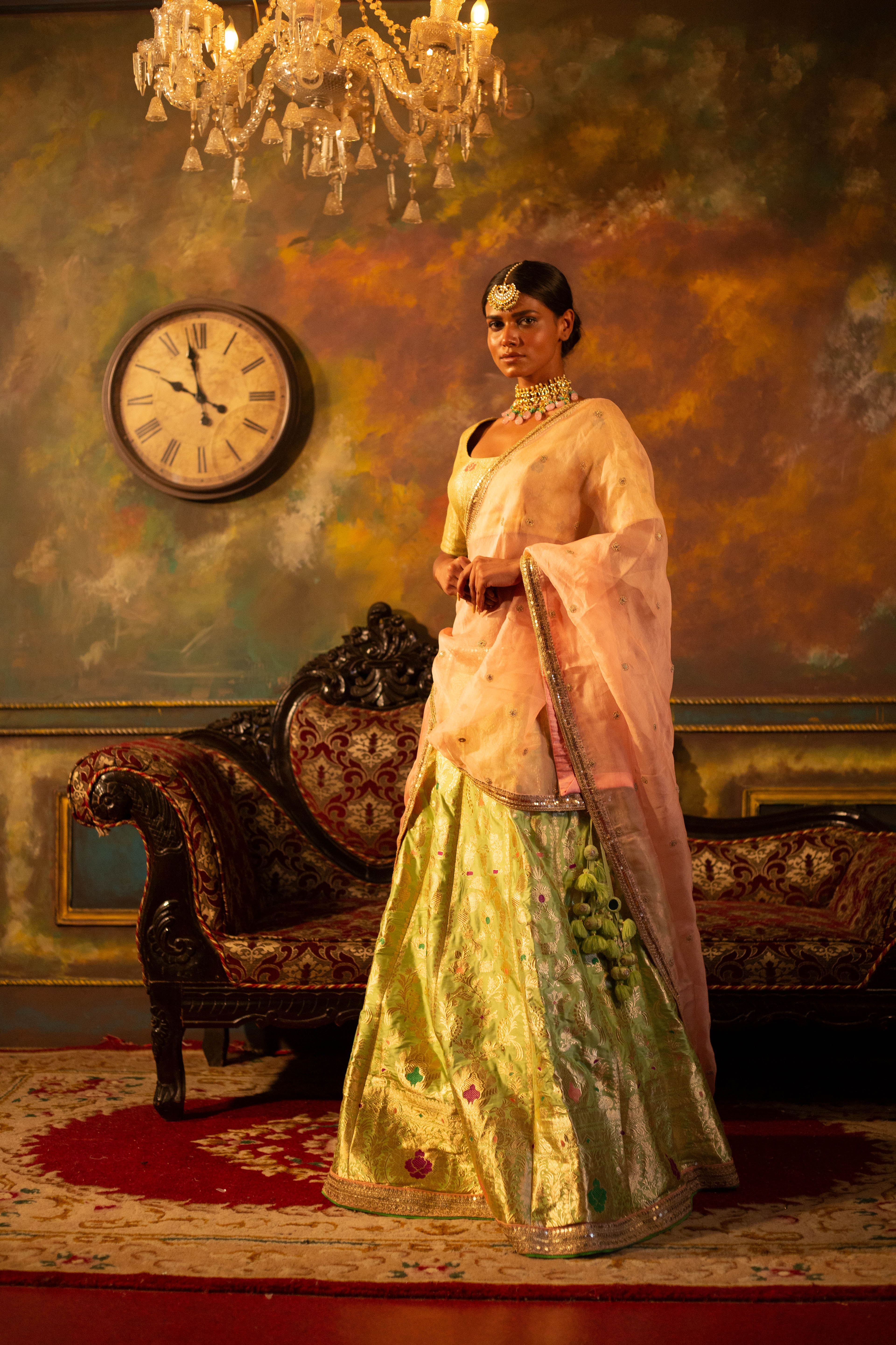Explore the epitome of traditional charm with our pure Banarasi handloom lehenga paired with a hand-textured blouse. This ensemble captures the essence of timeless elegance, showcasing the intricate artistry of Banarasi weaving. The harmonious blend of textures and patterns creates a celebration of heritage and style, ensuring you shine with grace and sophistication on your special day.