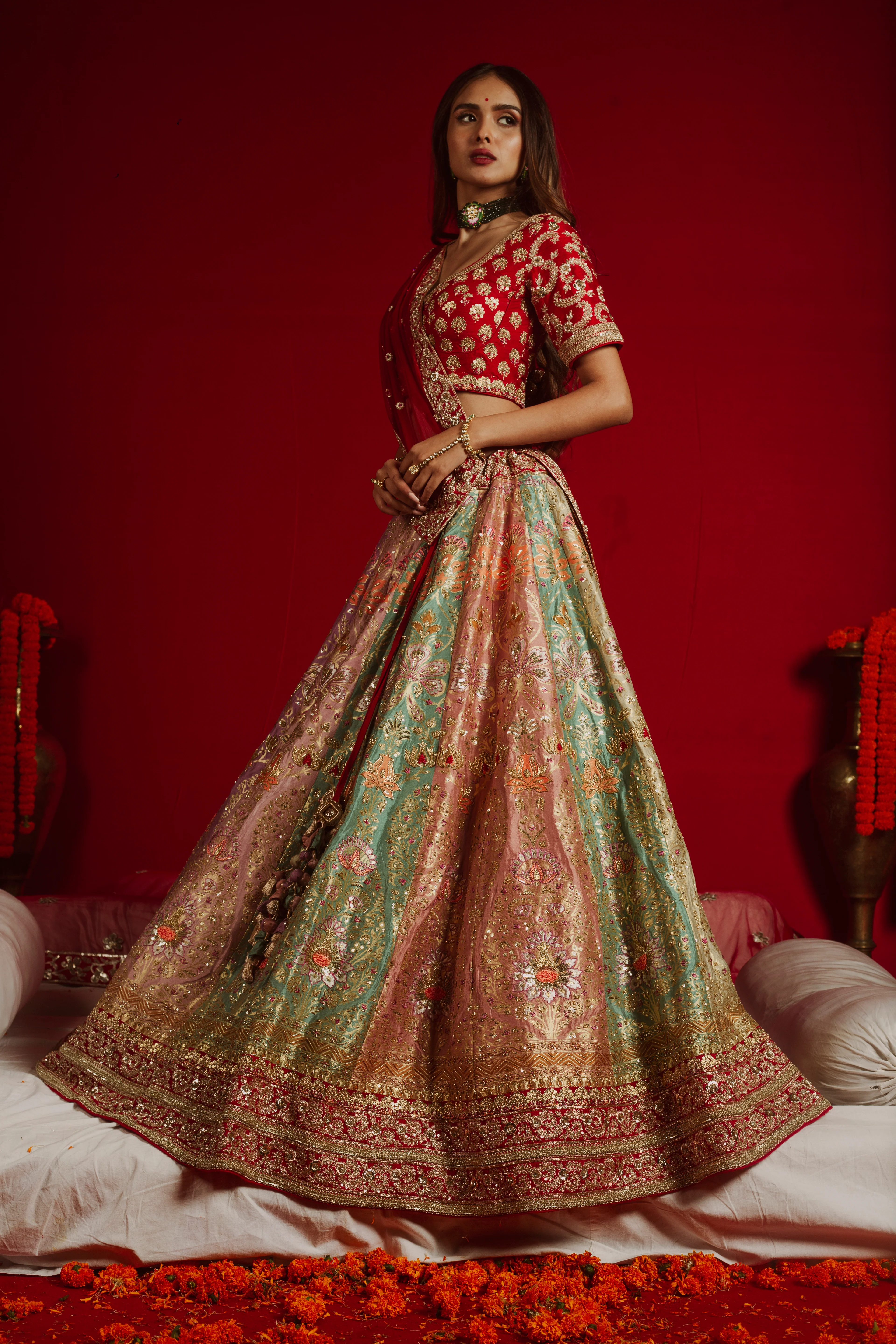 Step into a world of whimsical beauty with our Kaleidoscope Whimsy Ensemble, a vibrant mix of cotton, net, satin, and pure silk in a mesmerizing multicolored palette. The dynamic interplay of fabrics creates a kaleidoscopic effect, capturing the essence of joy and celebration. This unique ensemble is a testament to individuality and style, ensuring you radiate with a burst of colors that reflect the vivacity of your special day.