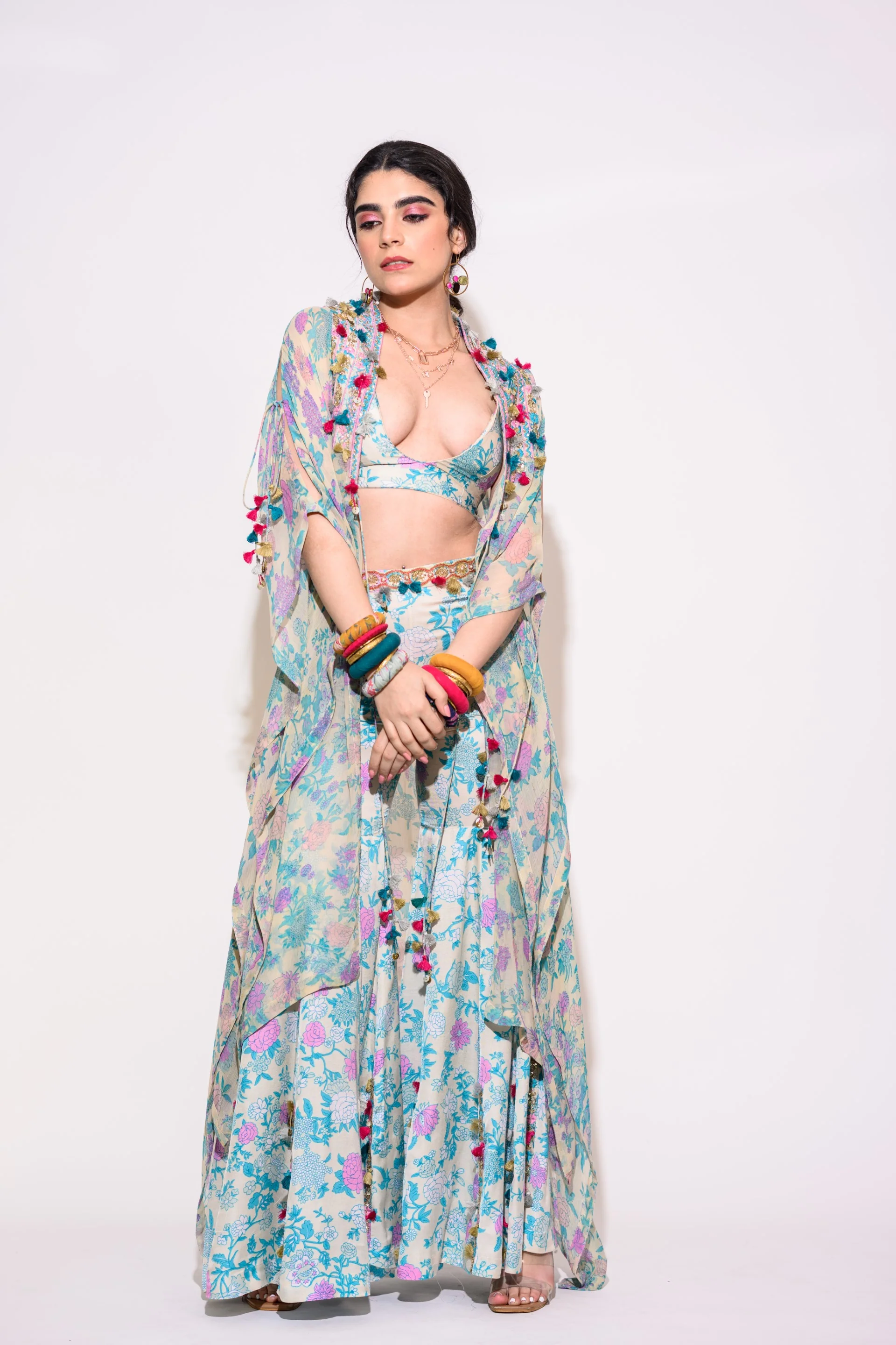 This beautiful light blue set comes with a crop top, overlay shrug, and palazzo pants. The light blue color of the kaftan with a trendy and bold deep v-neck provides aĀ chic and refreshing touch to the outfit, whereas the shrug adds a layer of sophistication and elegance to the outfit, making it suitable for a variety of different events.