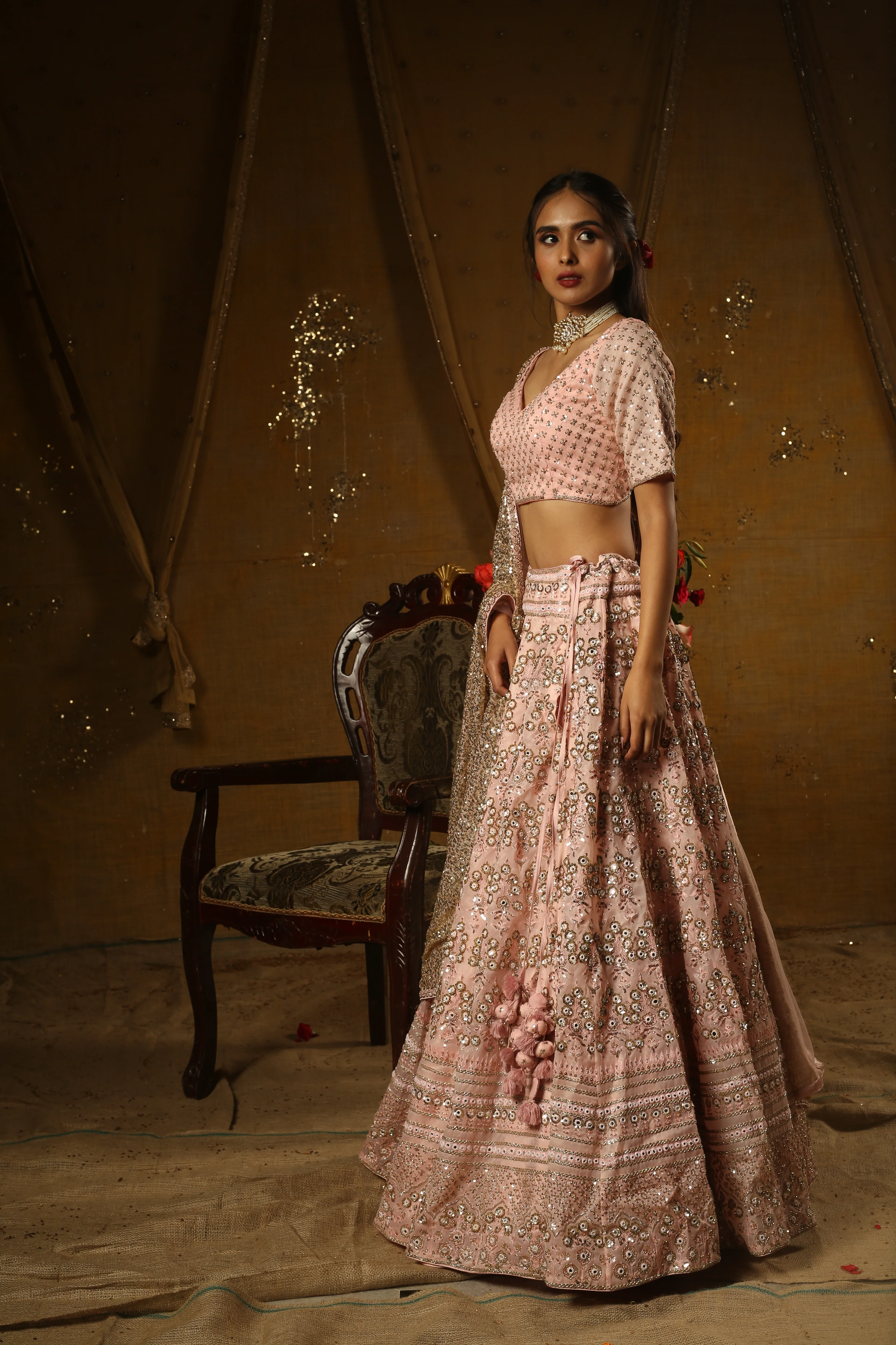 Immerse yourself in the allure of our organza lehenga, a canvas of hand-painted elegance adorned with intricate mirror work. This ethereal ensemble captures the essence of timeless beauty, blending artistry and craftsmanship to make your celebrations truly enchanting.
