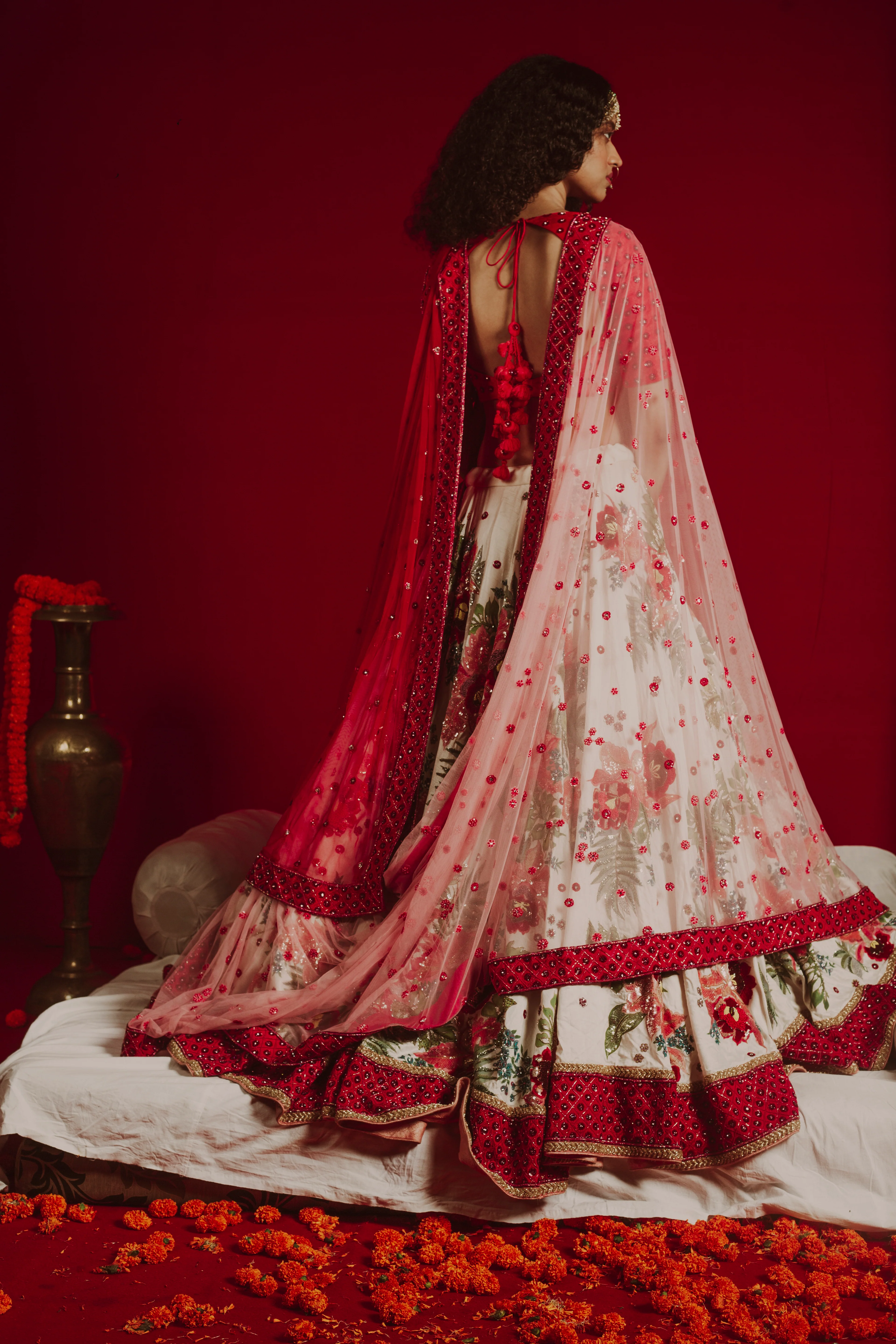 Indulge in the opulent craftsmanship of a lehenga, featuring exquisite hand painting and pure heavy work on the top. The zircon butti border and dupatta add a touch of sophistication. This ensemble includes two dupattas, offering versatility to your celebration attire. With every stroke and detail, this masterpiece tells a story of timeless elegance and grace.