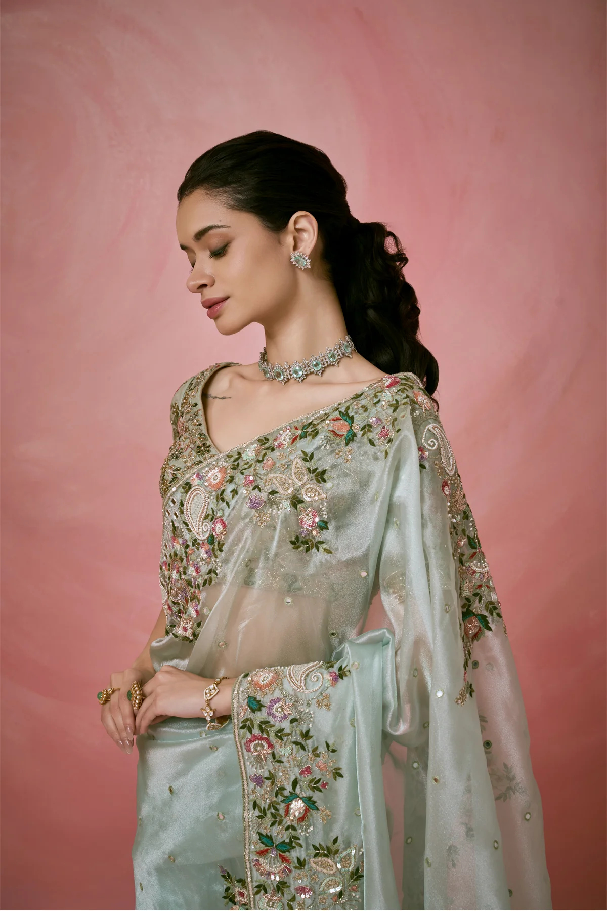 Channel celestial allure in our Sky Blue Metallic Organza Saree. The ethereal drape, crafted from metallic organza fabric, captures the essence of the sky's tranquility. Perfect for special events or evening soirees, this saree embodies sophistication and celestial beauty, ensuring you stand out with luminous grace.