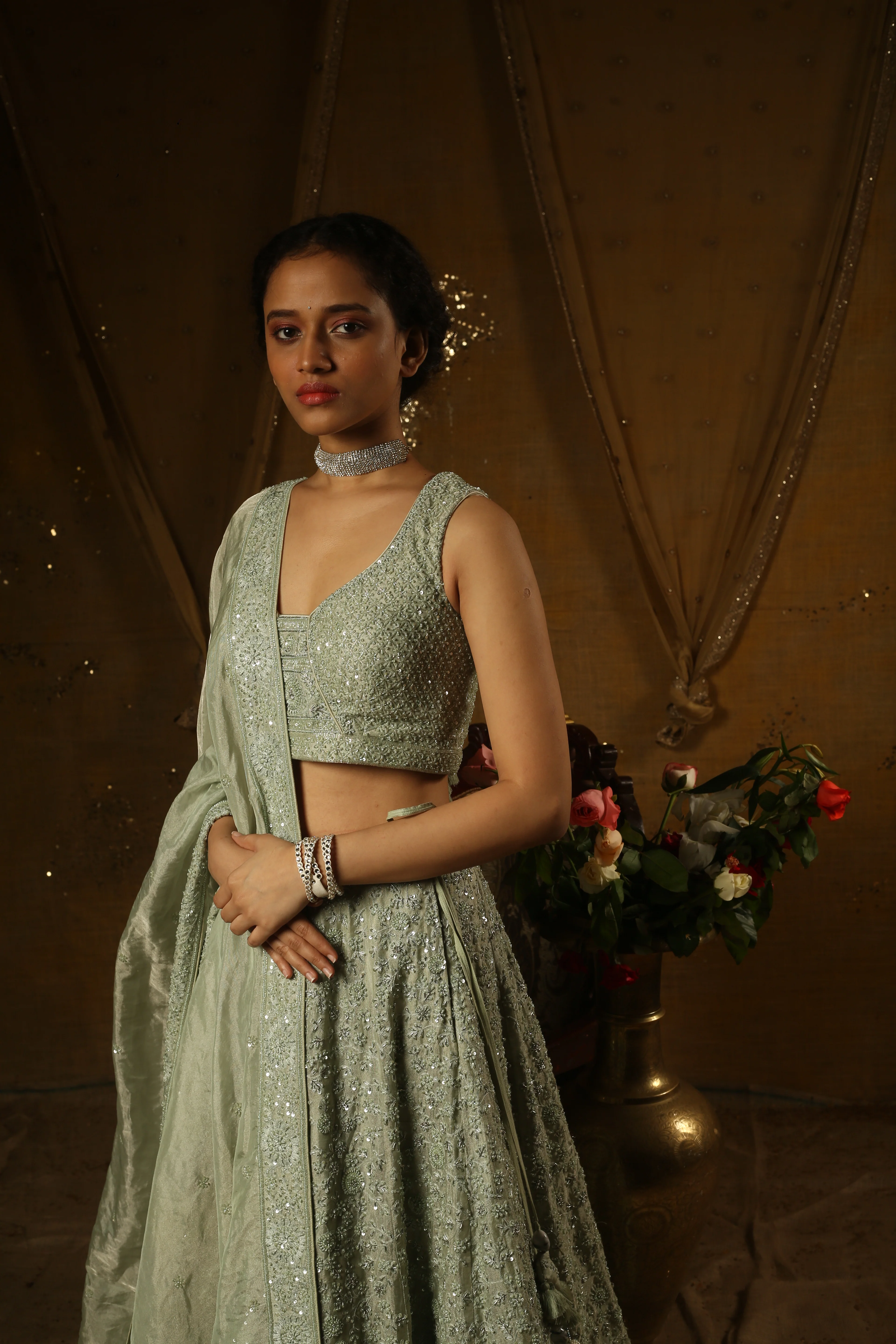 Step into a fairy tale with our lush green lehenga, a masterpiece of tissue, pearl, and sequence work. This opulent ensemble beautifully marries traditional charm with contemporary allure, ensuring you radiate grace and sophistication at every moment of your wedding celebrations.
