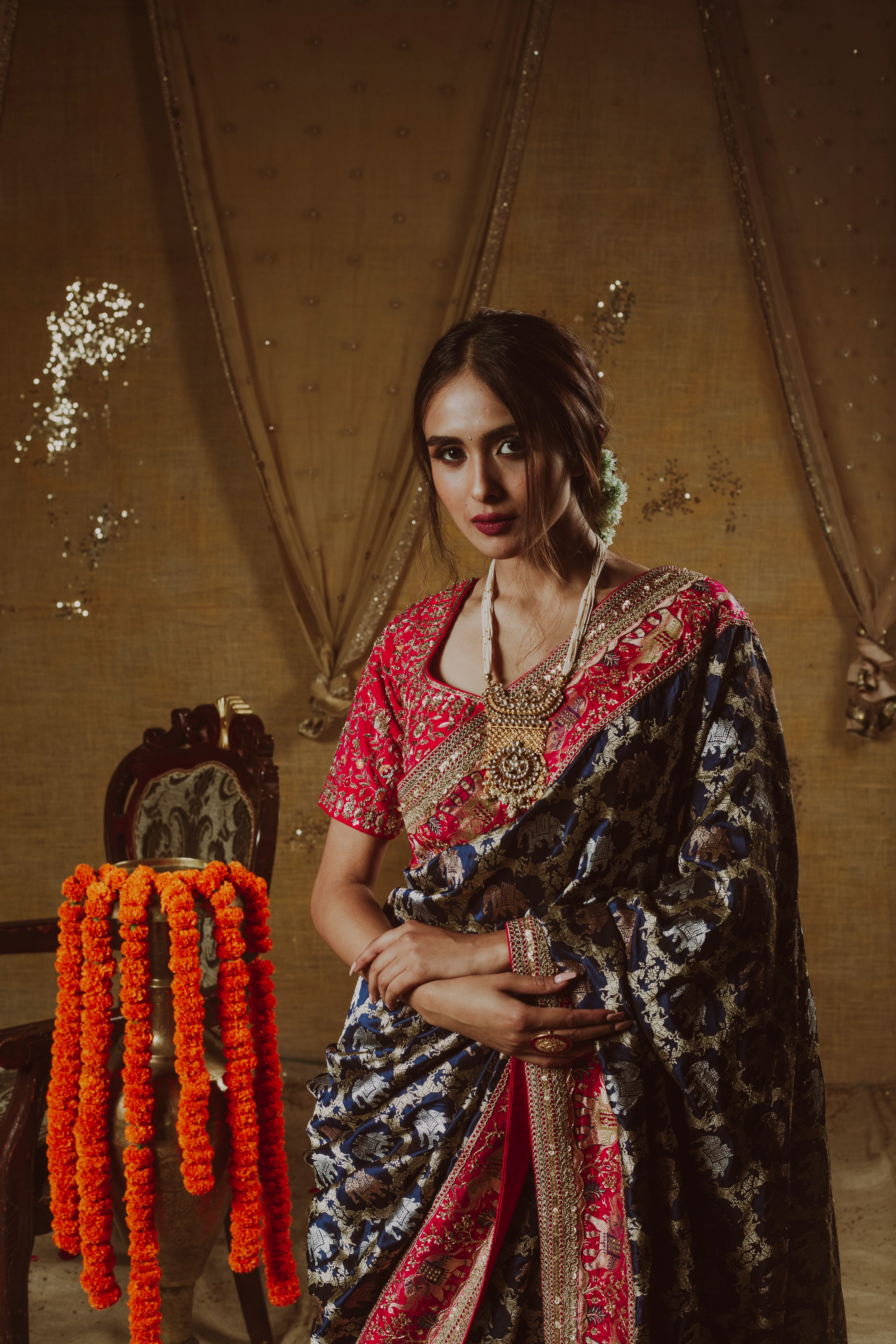 Wrapped in timeless allure, our Navy Blue Banarasi Handloom Saree boasts pure hand-dori work. The meticulous artistry of hand-dori complements the luxurious Banarasi weave, crafting a saree that exudes sophistication and tradition. In a deep navy blue hue, this saree makes a statement of refined elegance.