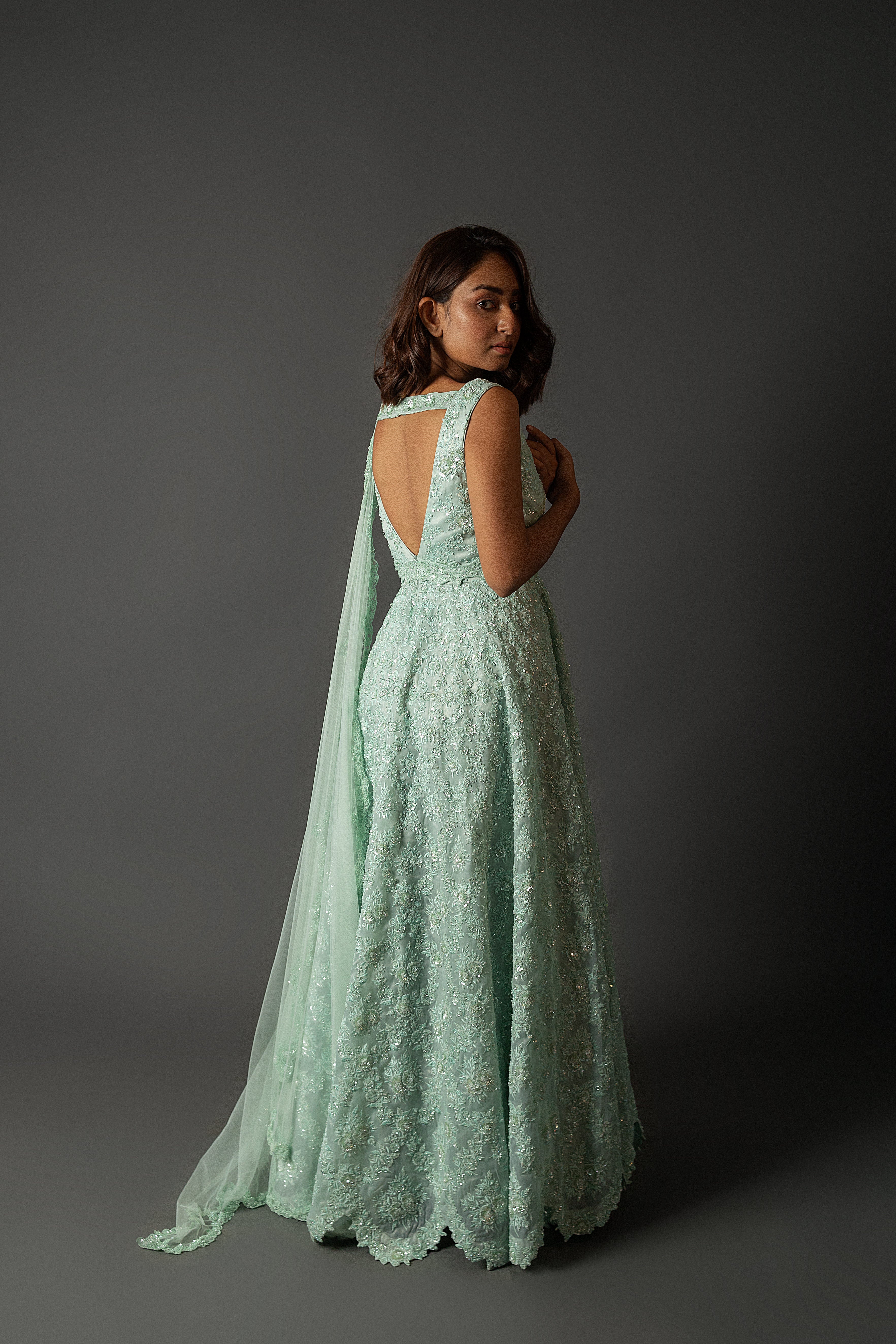 Dive into serenity with our Sea Green Organza Lehenga. Adorned with exquisite appliqué work, this enchanting ensemble captures the essence of ocean hues. Immerse yourself in elegance and grace, as the sea-green waves of fabric and delicate detailing create a vision of timeless beauty, perfect for your special moments