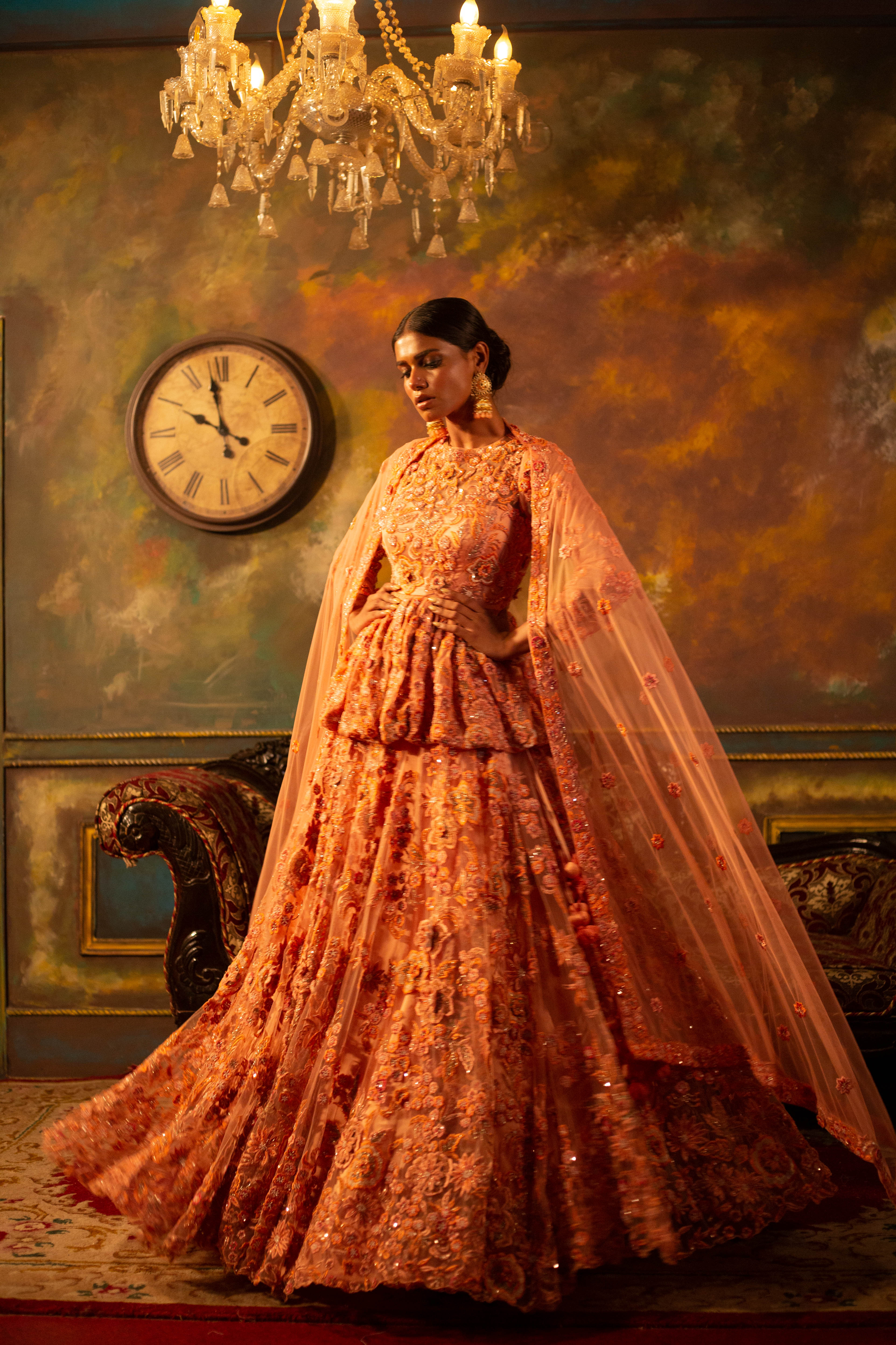 Experience luxury with our 3D Embossed Work Lehenga, featuring a sweeping flair of more than 6 meters. The peplum cut blouse adds a modern touch, creating a perfect blend of traditional and contemporary style. Customize your ensemble, ensuring each detail is tailored to your unique taste. This masterpiece is not just an outfit; it's a canvas waiting for your personal touch, making every step a statement of individuality and elegance.