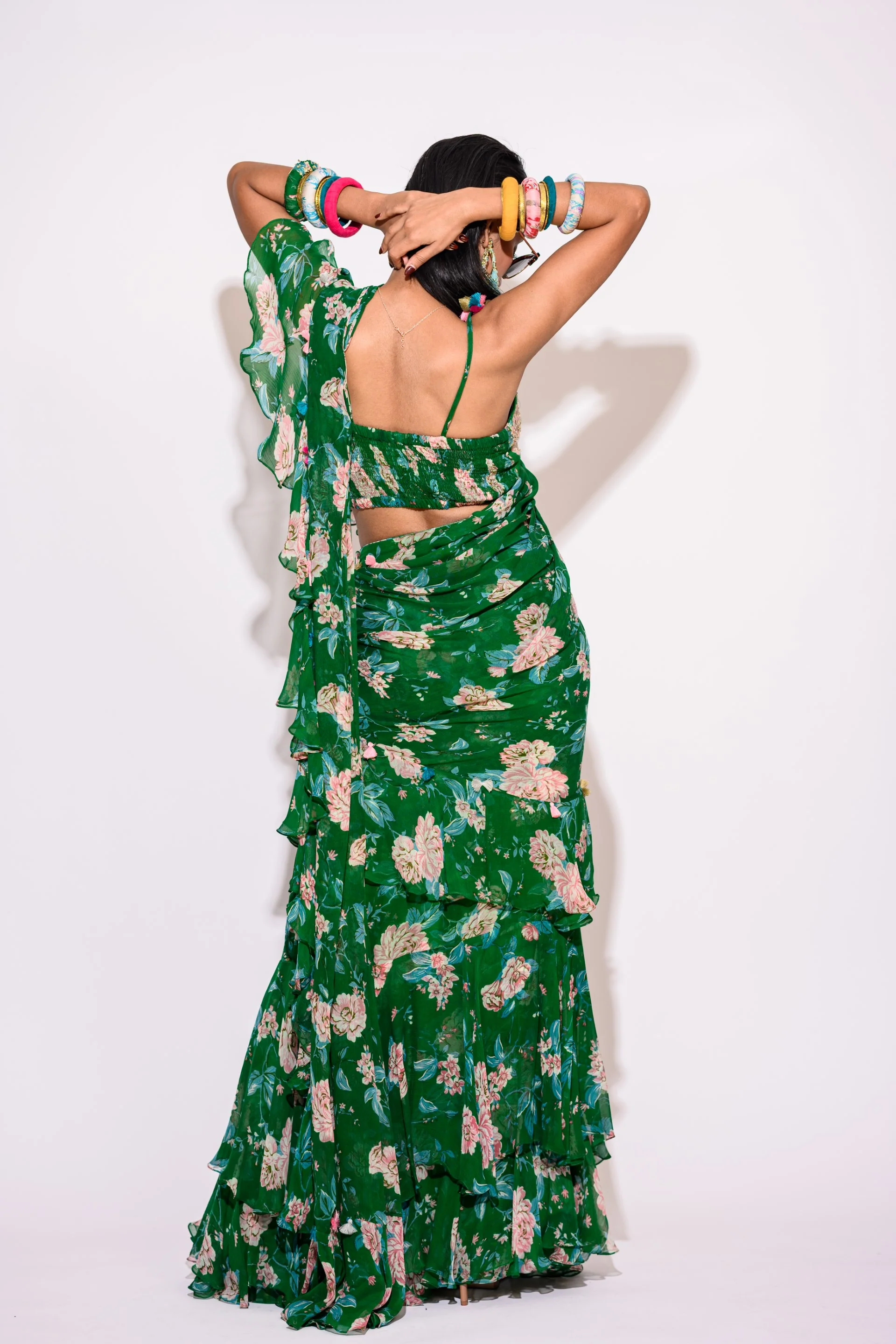 This floral printed set features a green pre-draped saree in chiffon base. It is paired with matching sleeveless blouse in chiffon with a deep V-neck, further uplifted with ruffled hem. Perfect for any outing and is sure to elevate your style!