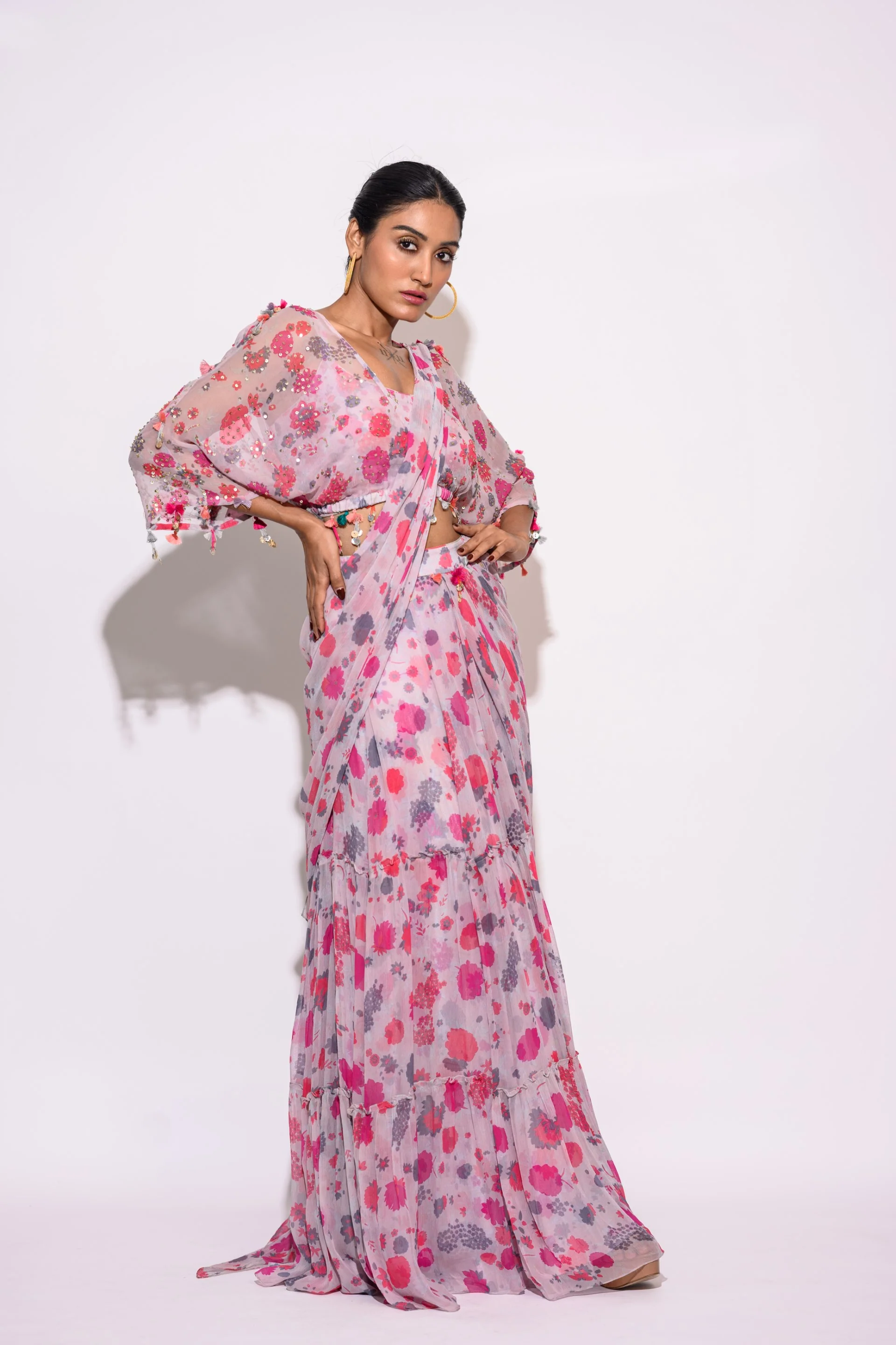 This set features a grey pre draped saree in chiffon base. It is paired with matching sleeveless blouse in chiffon and jacket overlay, further uplifted with sequins and dainty rhinestones dangling from the hem.