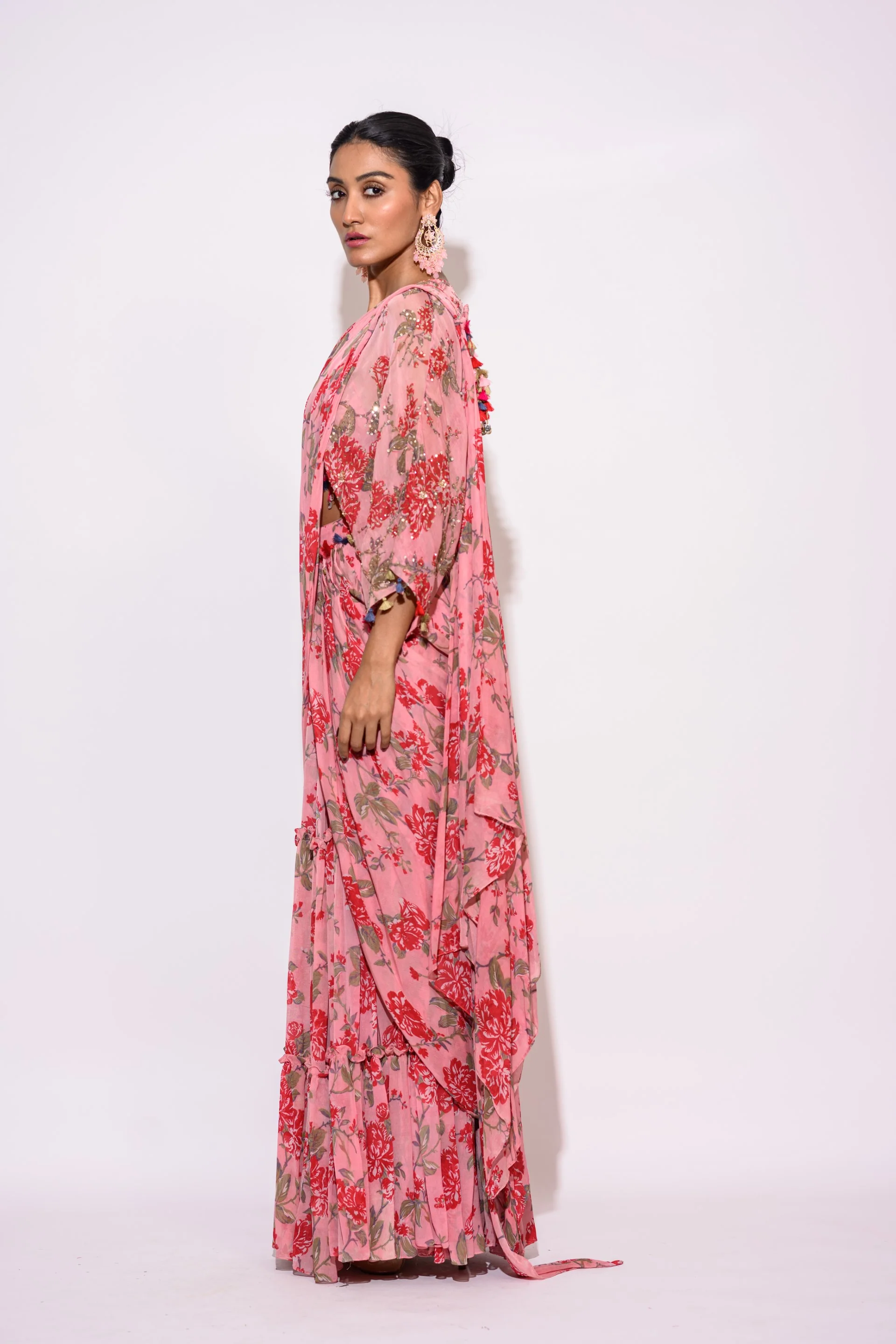 This set features a pink pre draped saree in chiffon base. It is paired with matching blouse in chiffon with a deep v-neck, further uplifted with sequins and dainty tassels dangling from the hem.