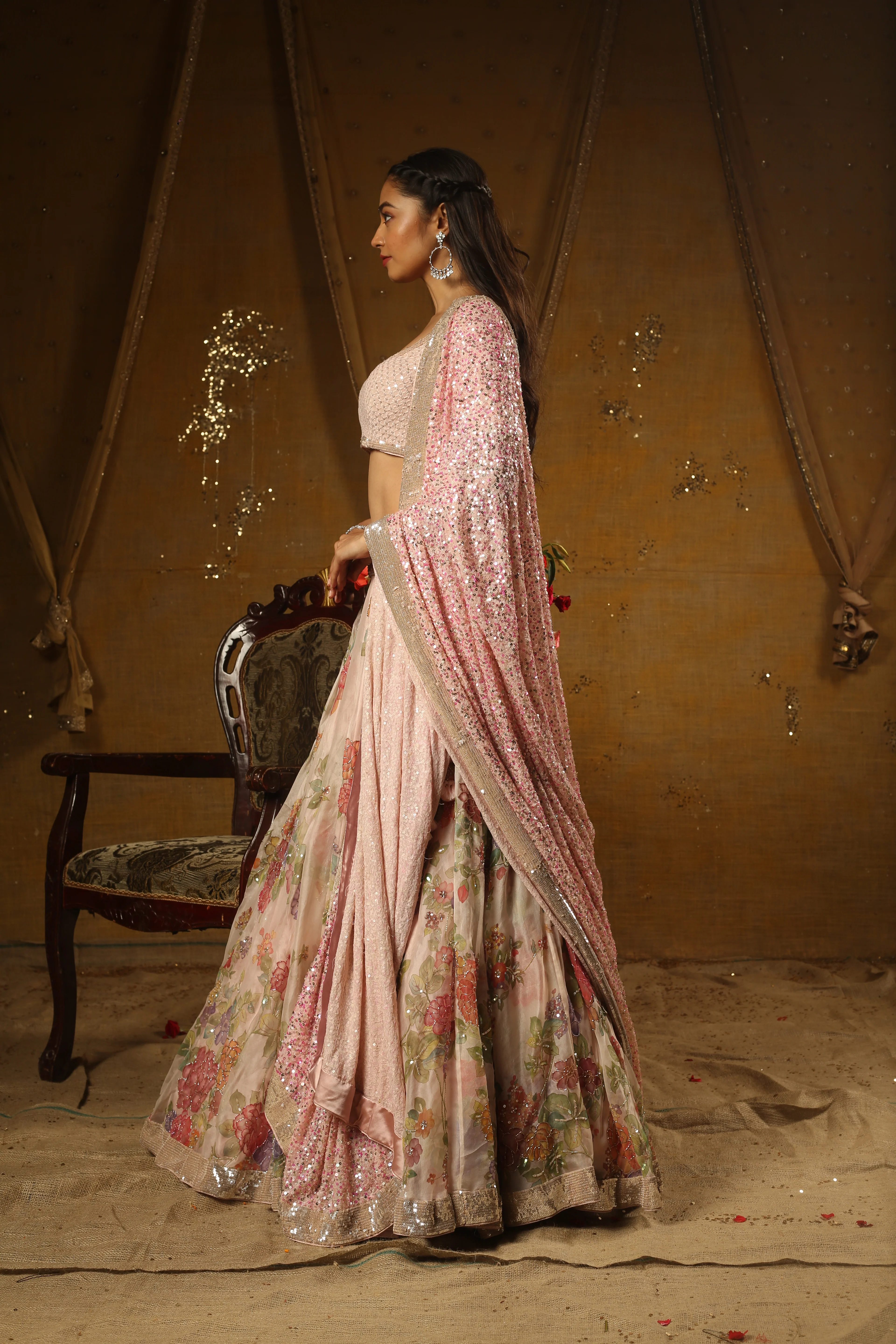 Indulge in pure sophistication with our organza lehenga set. The hand-sequined dupatta adds a touch of glamour, while the intricately hand-painted lehenga, with its more than 9 meters flair, promises to make you the epitome of elegance at every moment of your joyous wedding celebrations.