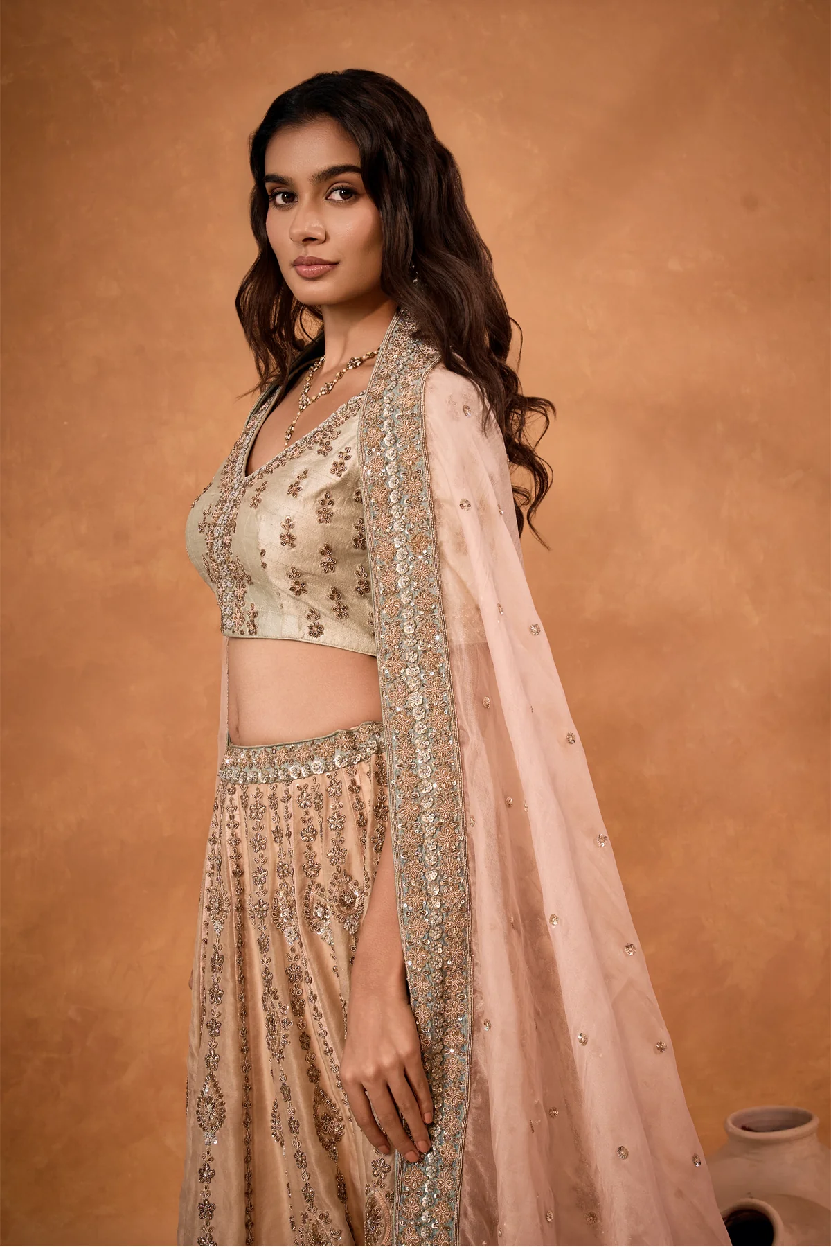 Embrace the delicate allure of our lehenga crafted from organza, satin, and cambric fabrics in a soft peach hue. The combination of these luxurious materials creates an ensemble that embodies elegance and sophistication. Revel in the ethereal beauty as the fabrics gracefully drape, adding a touch of timeless grace to your celebratory moments.
