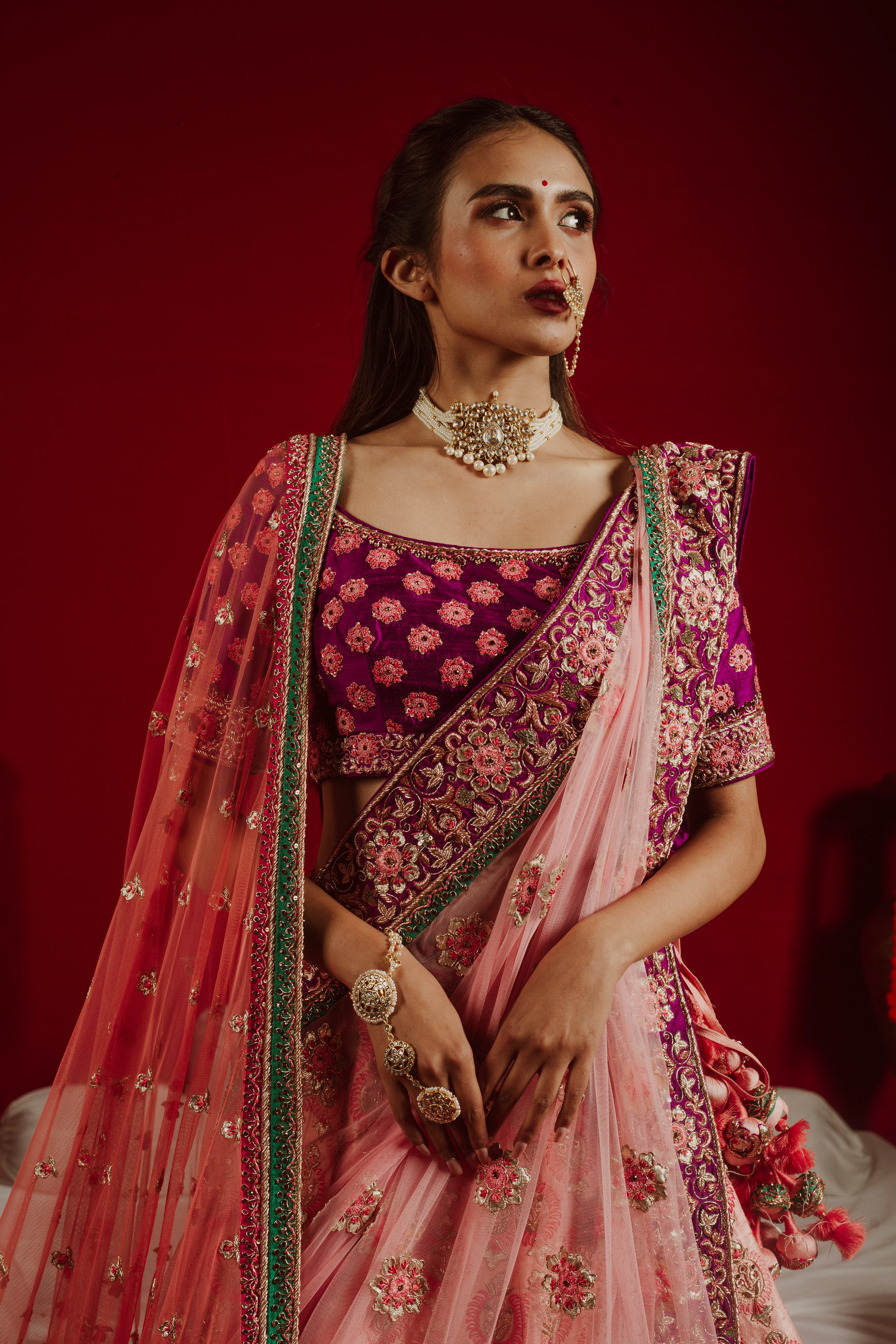 Embrace enchanting harmony of our lehenga , a fusion of raw silk, cotton, net, and satin in a delightful pink with purple accents. The dynamic blend of fabrics creates a symphony of textures, while the vibrant color palette adds a touch of whimsical elegance. The exquisite craftsmanship and thoughtful design make this ensemble a celebration of grace and style, ensuring you shine with radiance as day transitions into twilight on your special occasion.