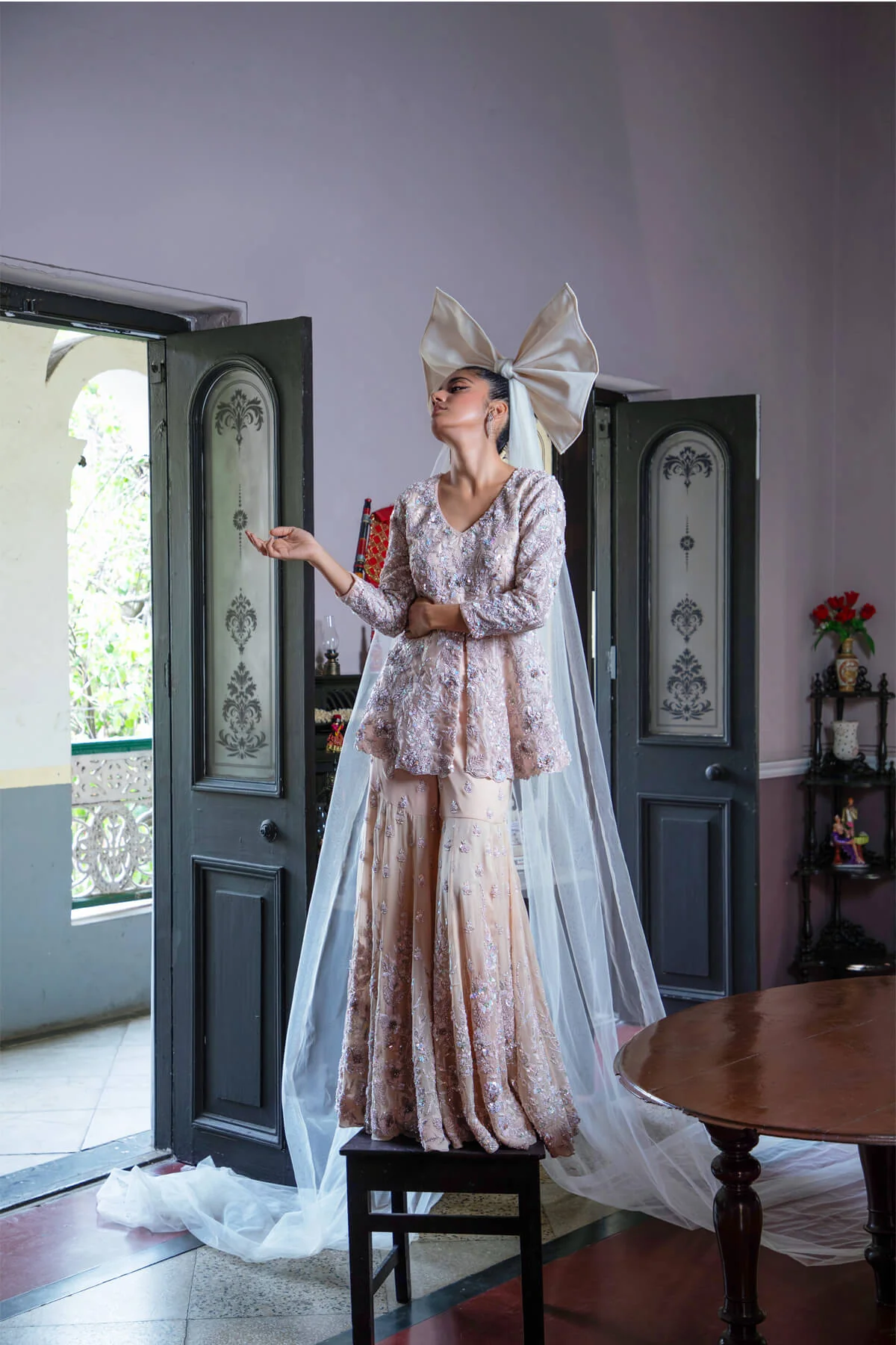 The Starry Serenade Sharara Bridal Sharara Set is perfect for special occasions and weddings. Made from soft organza and chiffon, this sharara is both elegant and comfortable. The organza gives it a beautiful, subtle shine, while the chiffon adds a light and flowing feel. Together, these fabrics create a stunning sharara that is easy to wear and perfect for celebrating in style. The Starry Serenade Sharara ensures you look and feel your best on your special day.