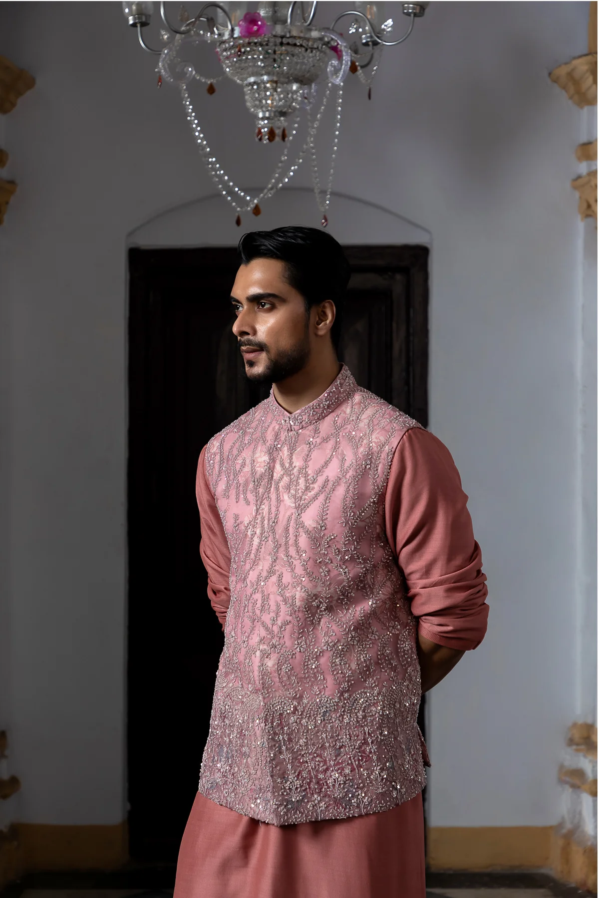 This meticulously crafted kurta elevates your look. The luxurious blend of pure silk and breathable cotton offers a comfortable drape, while the focus is on the statement collar and cuffs. Delicate organza adds a touch of modern texture and a hint of understated shine to these key details. This innovative piece is perfect for the discerning man seeking both comfort and a touch of sophisticated style.