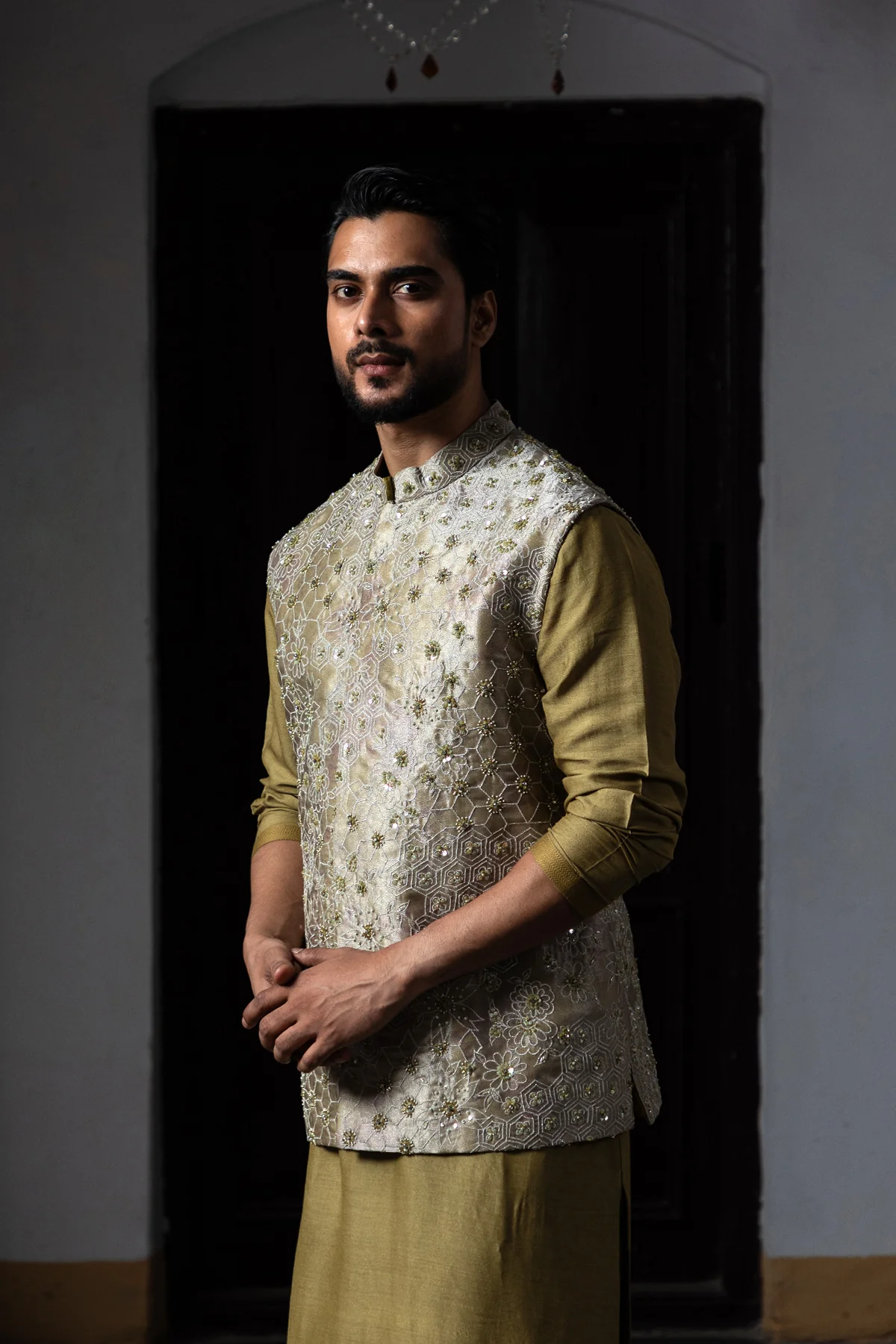 This contemporary creation redefines traditional menswear with its innovative blend of fabrics. The outer shell features a captivating textural symphony: organza's airy elegance dances alongside mudal satin's rich sheen, creating a truly eye-catching statement. A hidden layer of breathable mul cotton ensures all-day comfort, while subtle hints of munga georgette's unique texture peek through, adding a touch of modern mystique. This jacket is the perfect fusion of heritage and innovation, ideal for the confident Indian man who wants to turn heads and redefine traditional style.